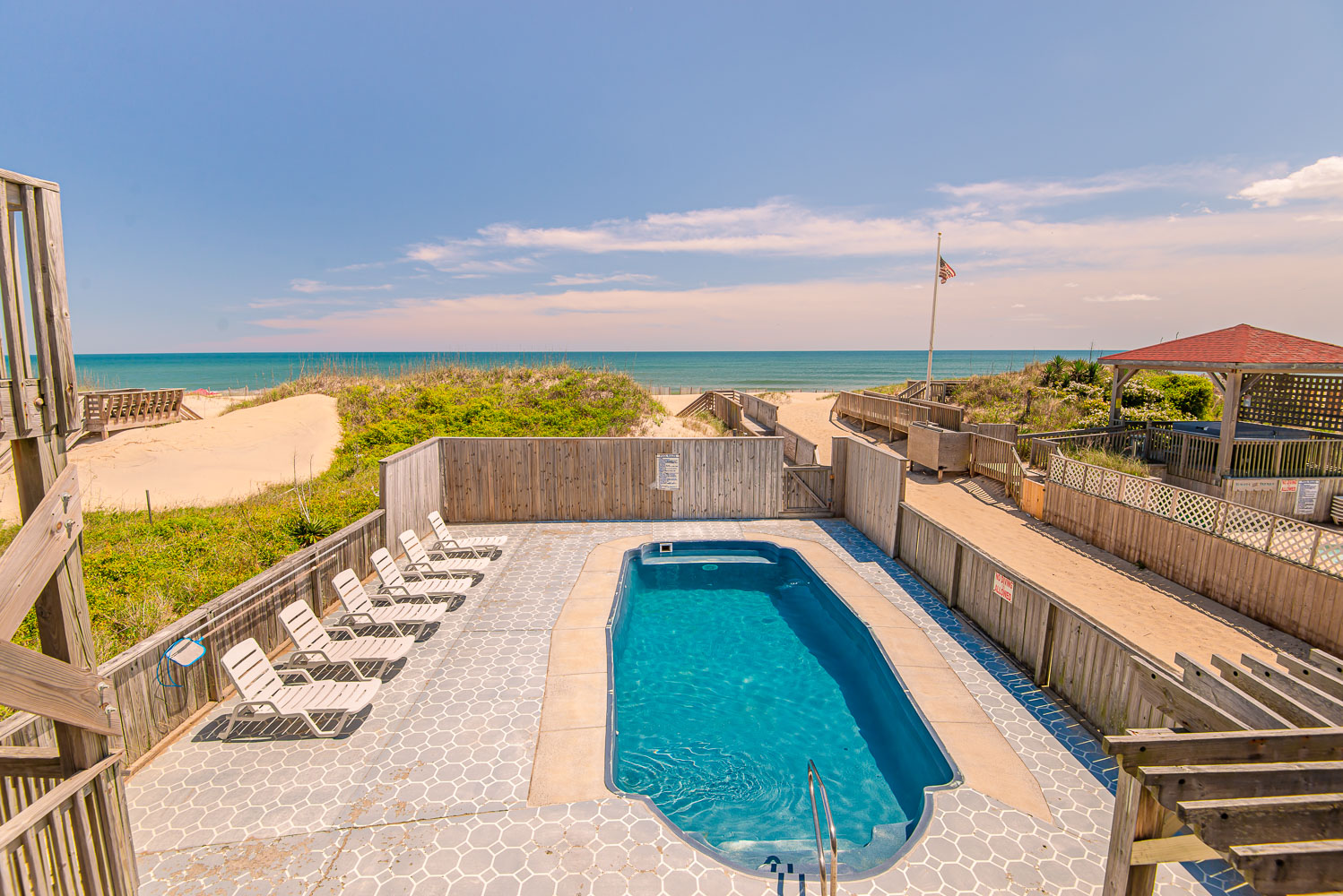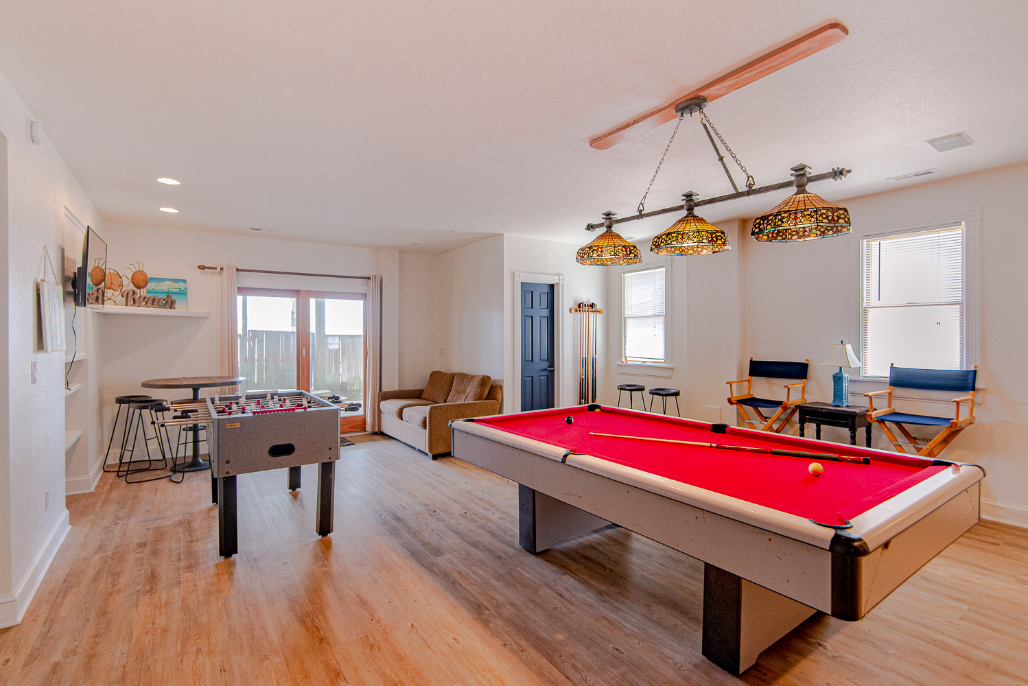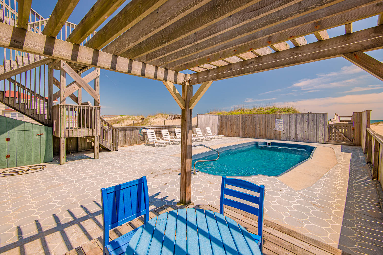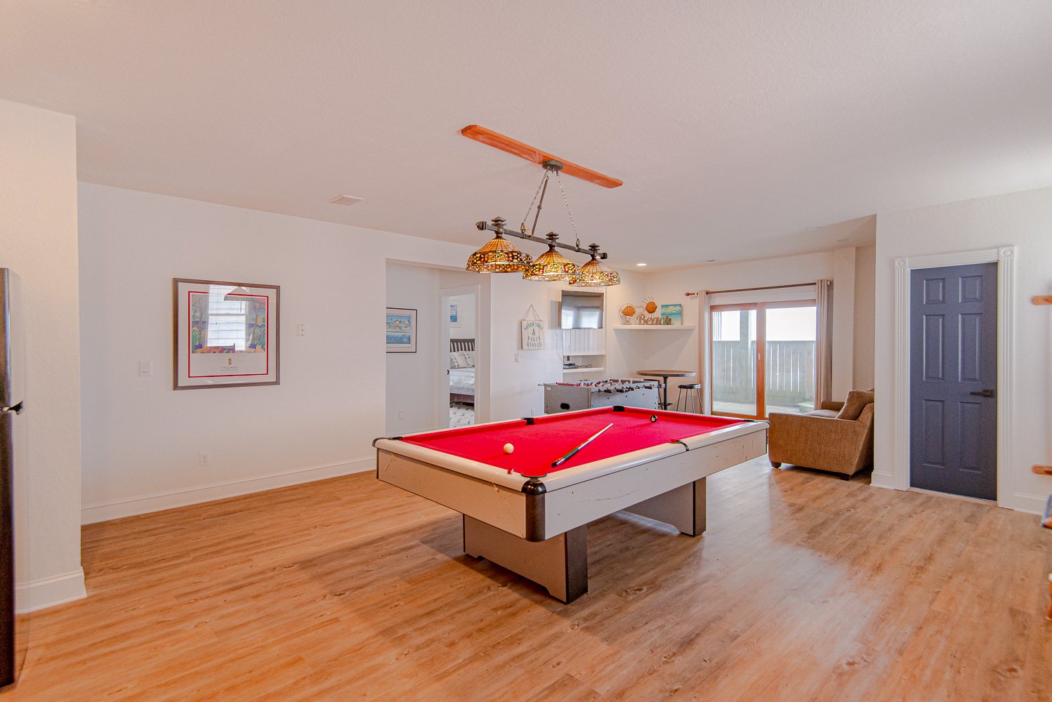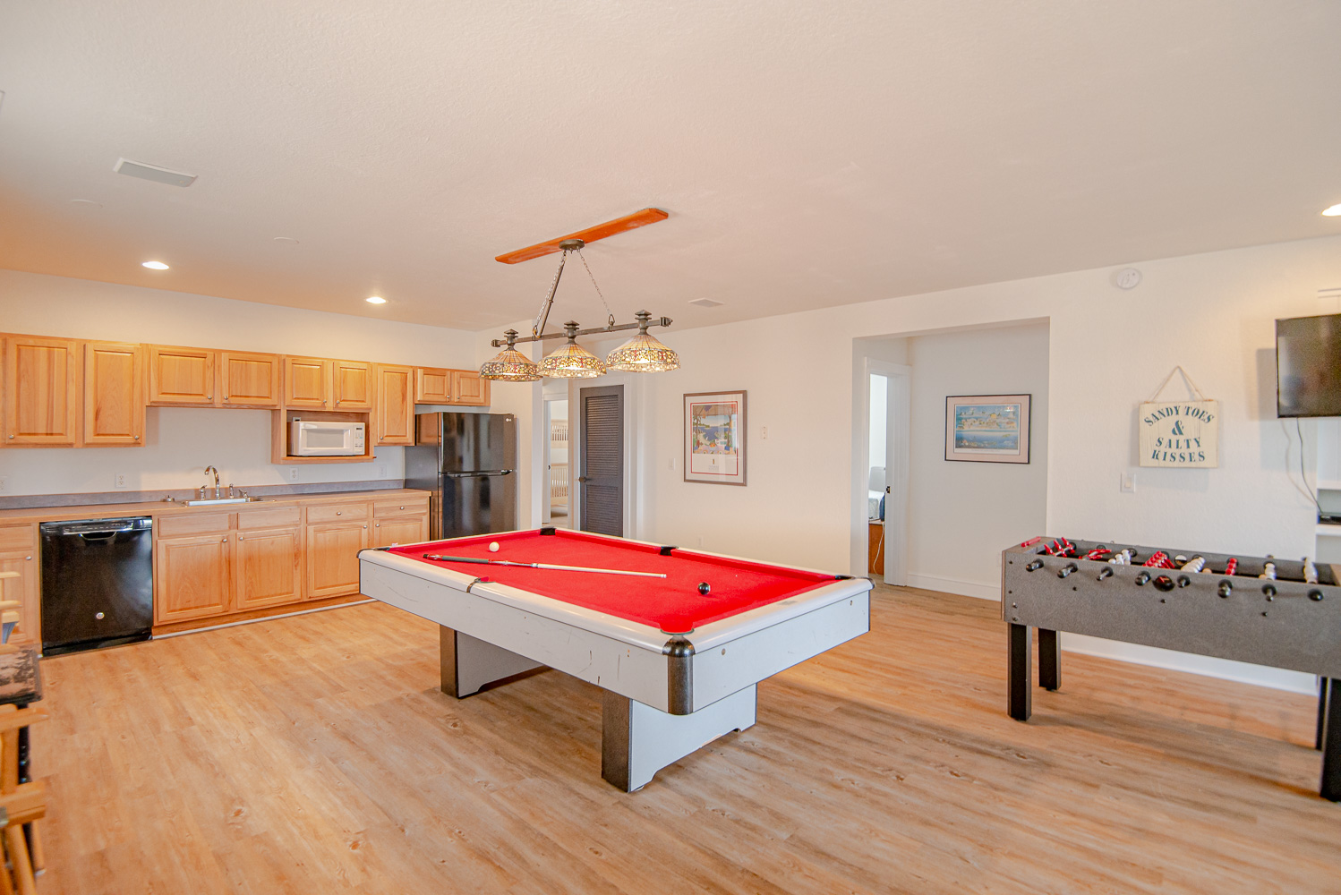 Ground Level: Parking for 8 Cars, Entry to Home, Large Rec. Room w/Pool Table, Foosball Table, TV, Large Wet Bar w/Dishwasher, Microwave, Full Size Refrigerator; Half Bath, Laundry Room w/2 Washer/Dryers, 3 Bedrooms (1 w/Queen, TV, Shared Full Bath w/Tiled Walk-In Shower (Shared w/Rec. Room); 1 w/Bunk Set, Single, TV; 1 w/Duo Bunk, TV, Shared Full Bath), Access to Private Swimming Pool - Open Seasonally, Large Pool Deck, Pool Side Pergola w/Table, Four (4) Chairs, Gas Grill, Enclosed Outside Shower, Private Walkway to Beach w/Shower.