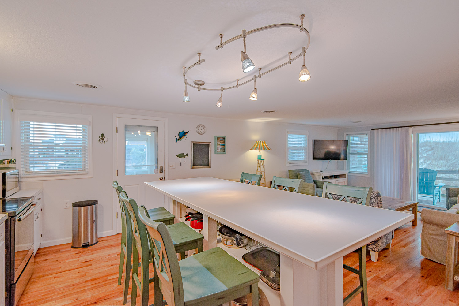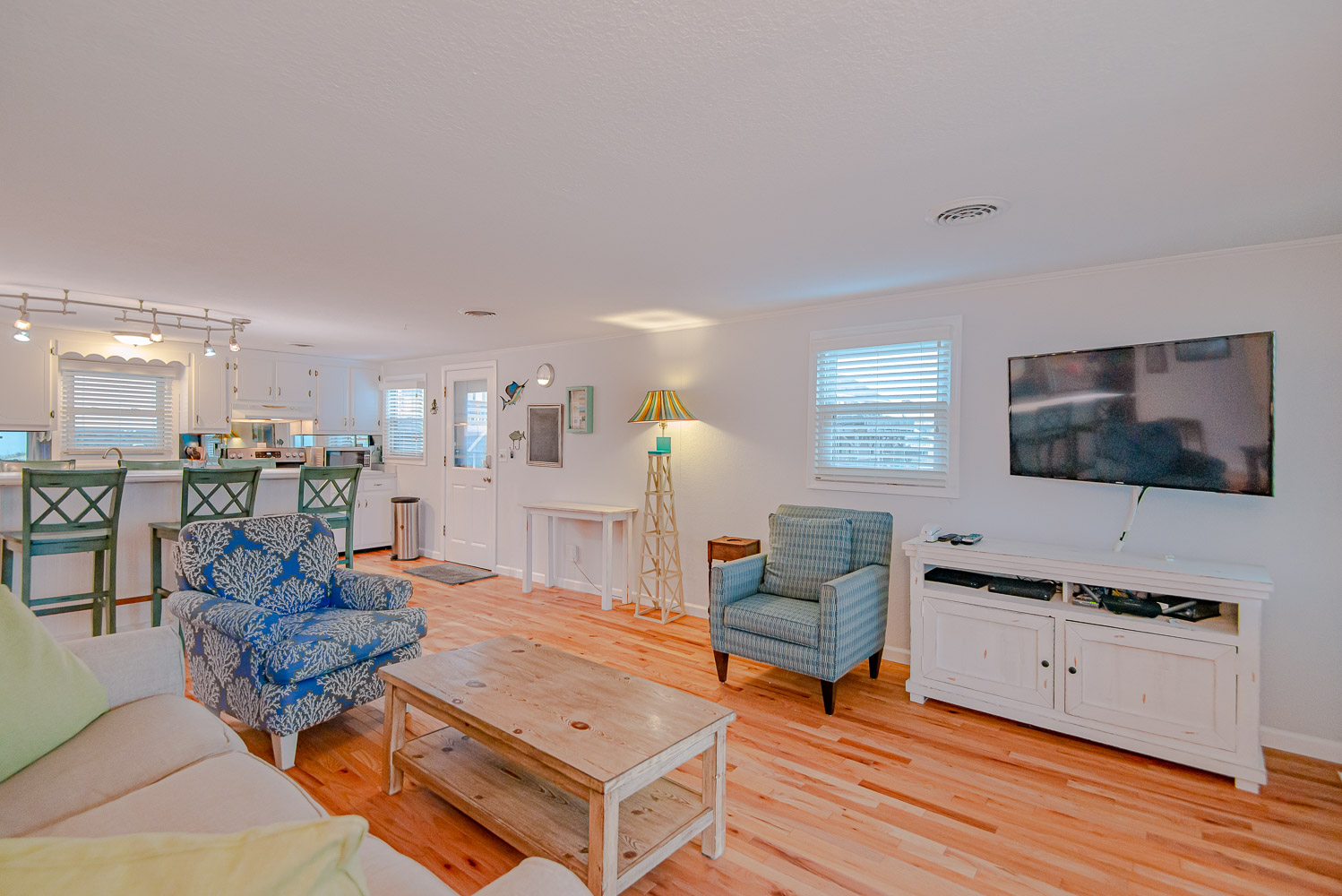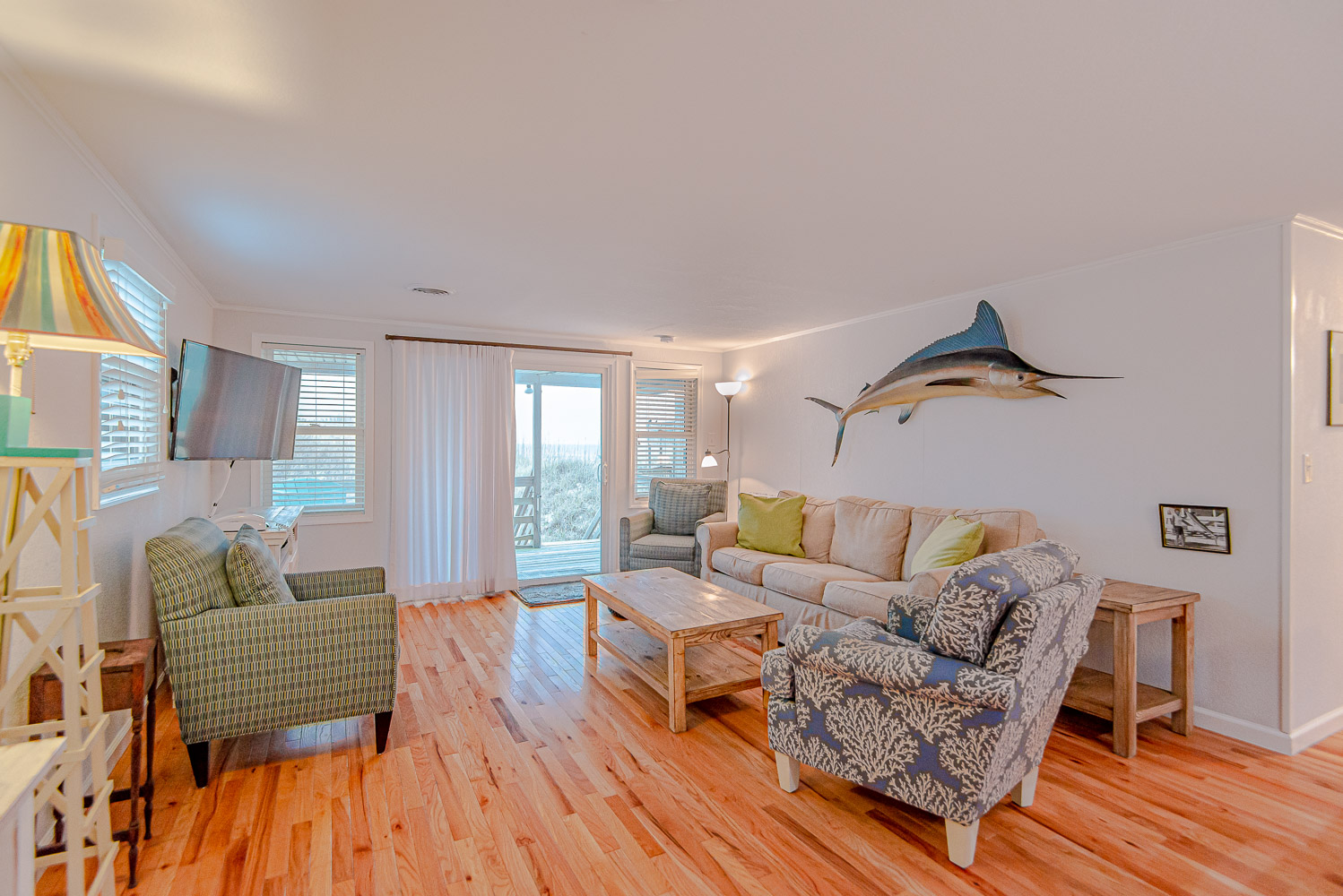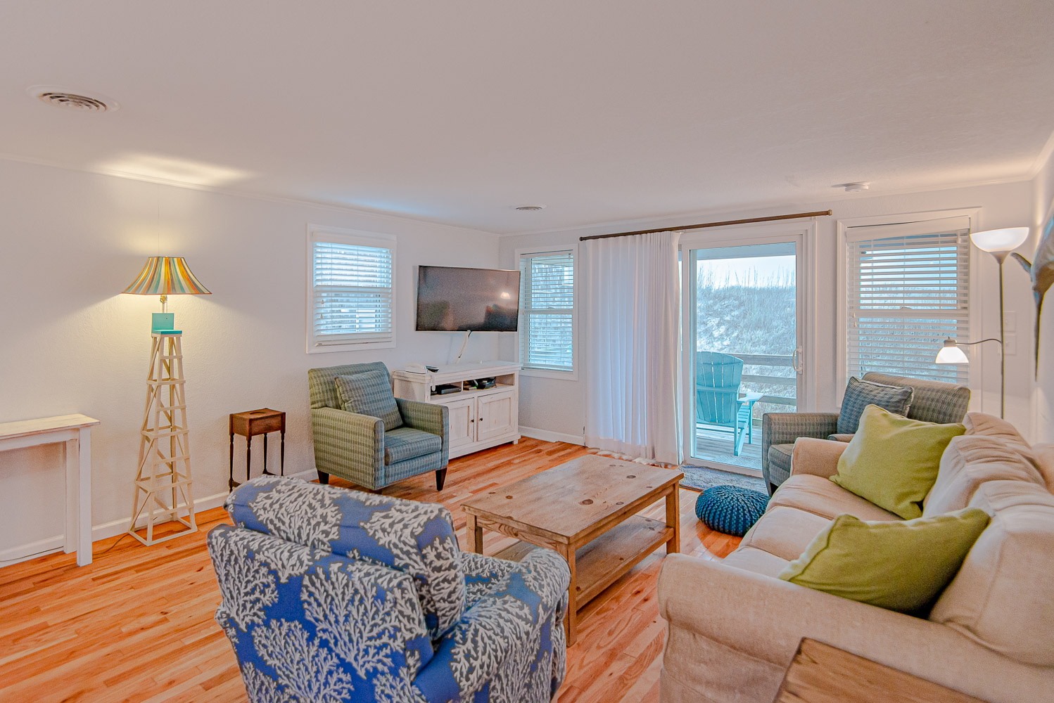 Main Level: Living/Dining/Kitchen Combo, Ocean Views, 2 Smart Flat Screen TV’s (48 Inch & 40 Inch), Queen Sleep Sofa, Hardwood Floors, Island Bar Dining, 3 Bedrooms (Private Suite w/Queen, TV, & Full Bath, 1 w/Queen, 1 w/2 Singles), Full Hall Bath, & a Covered Oceanfront Deck.