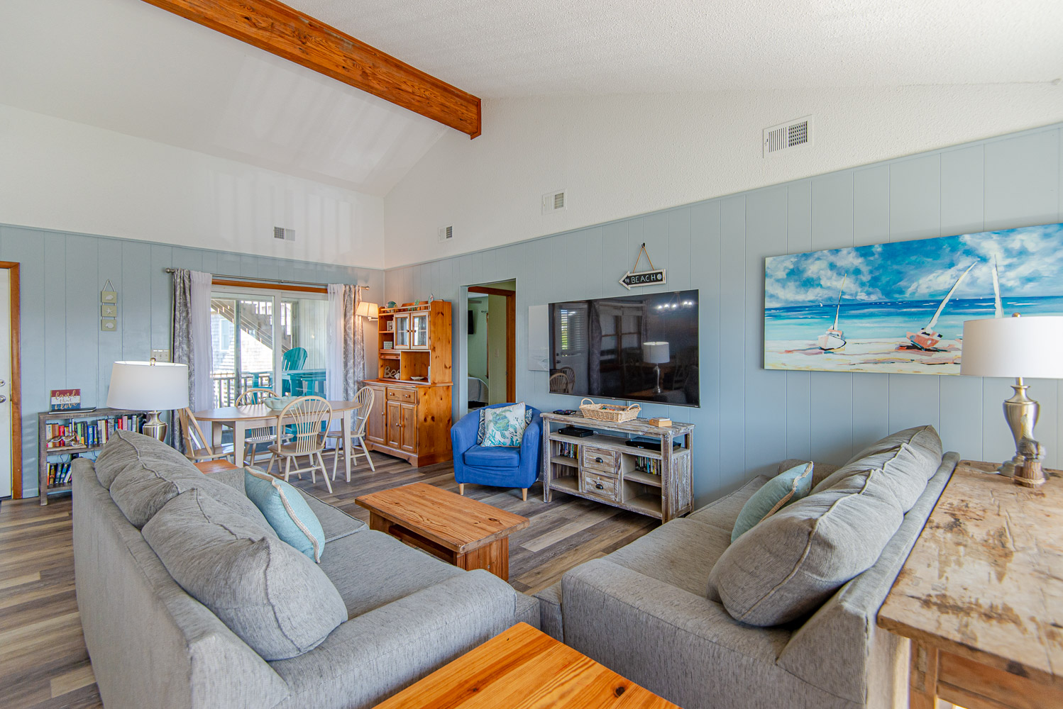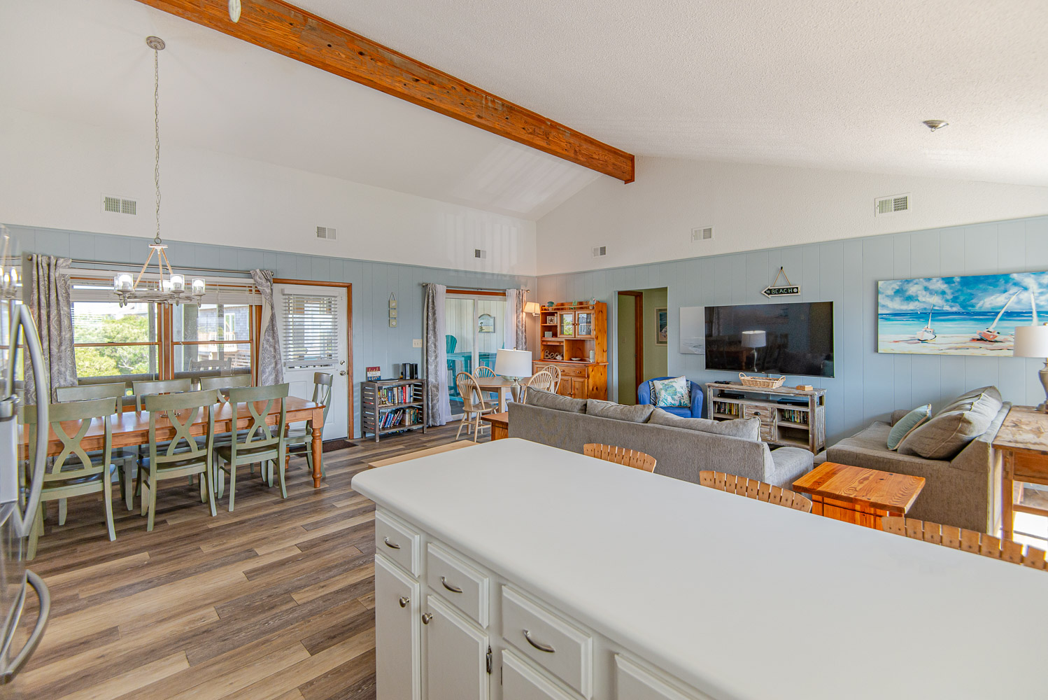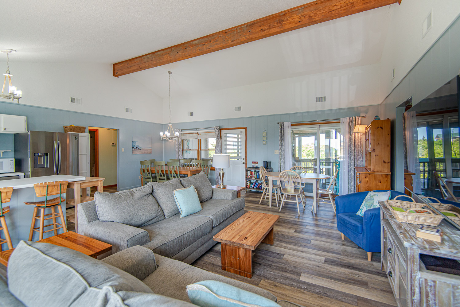 Main Level: Living/Dining/Kitchen Area, TV, DVD, 4 Bedrooms (2 w/Kings, 1 w/Queen, TV; 1 w/Duo Bunk Set w/Trundle, TV), 2 Full Baths, Screen Porch w/Furniture, Sun Deck w/Furniture, and Steps to Observation Deck w/Furniture and Beautiful Ocean Views.