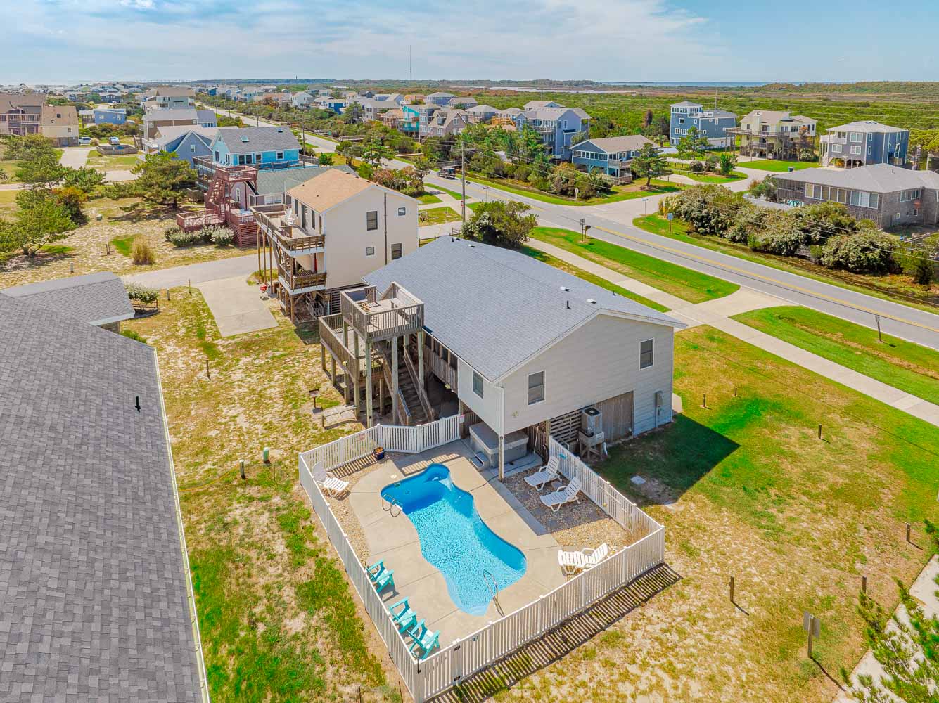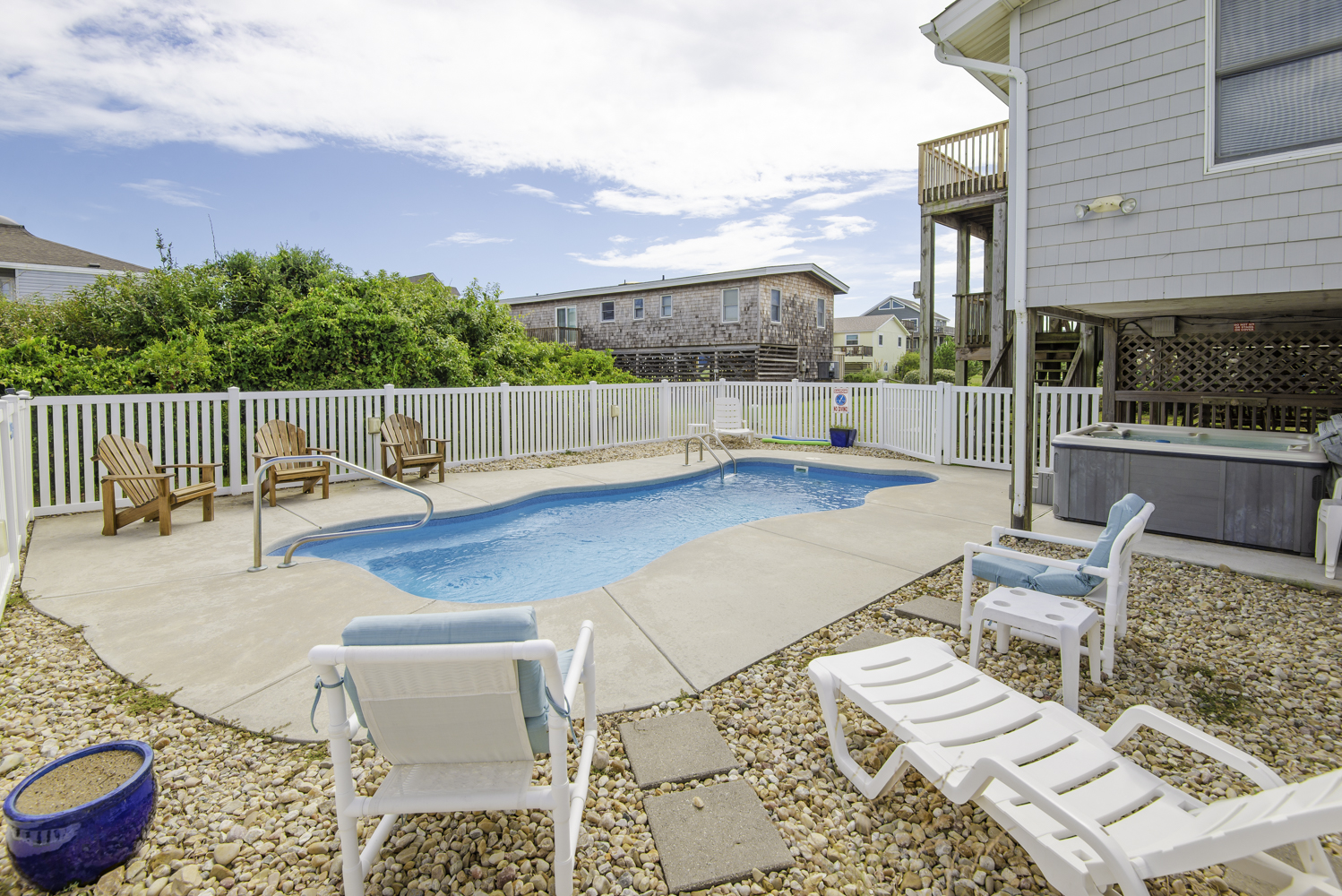 Located Oceanside in South Nags Head, Live This Dream is a lovely vacation home that provides modern updates along with an outstanding location that affords easy access to the beach (only 320 feet to the beach via Proteus Ct.), observation deck with ocean views, screened porch, Private Swimming Pool, and Hot Tub! This is a terrific home that has a quiet, peaceful location at the 20 mile post yet is convenient to so much that the Outer Banks has to offer. The Outer Banks Fishing Pier and Fish Heads restaurant are only a mile and half to the north and the Oregon Inlet Fishing Center and Cape Hatteras National Seashore are a few miles south. Shopping and dining establishments abound at the milepost 16 area in Nags Head and the great shops and attractions of Manteo are only a short drive away. Live This Dream is an ideal family vacation destination.