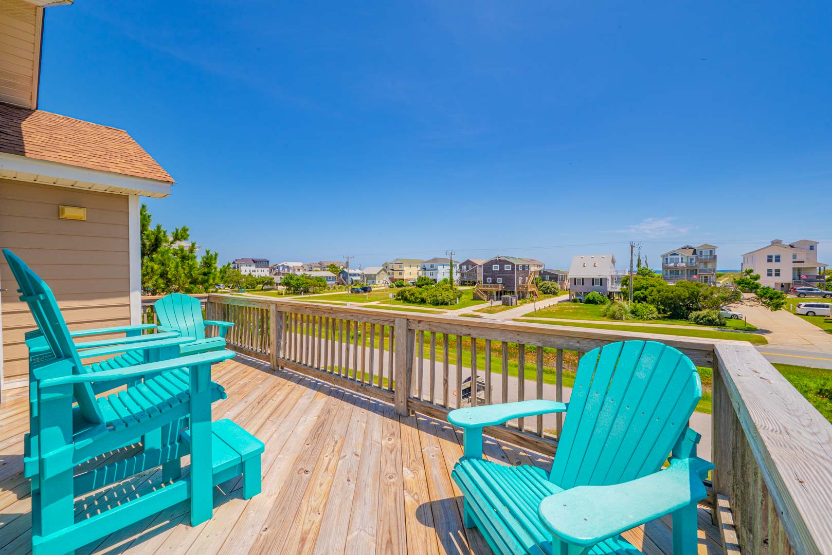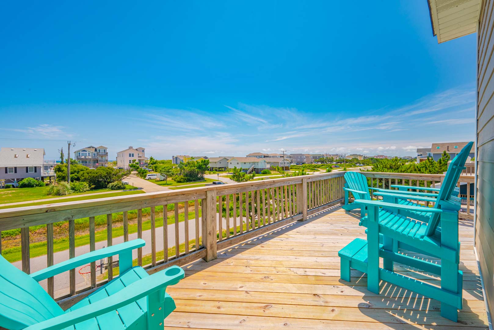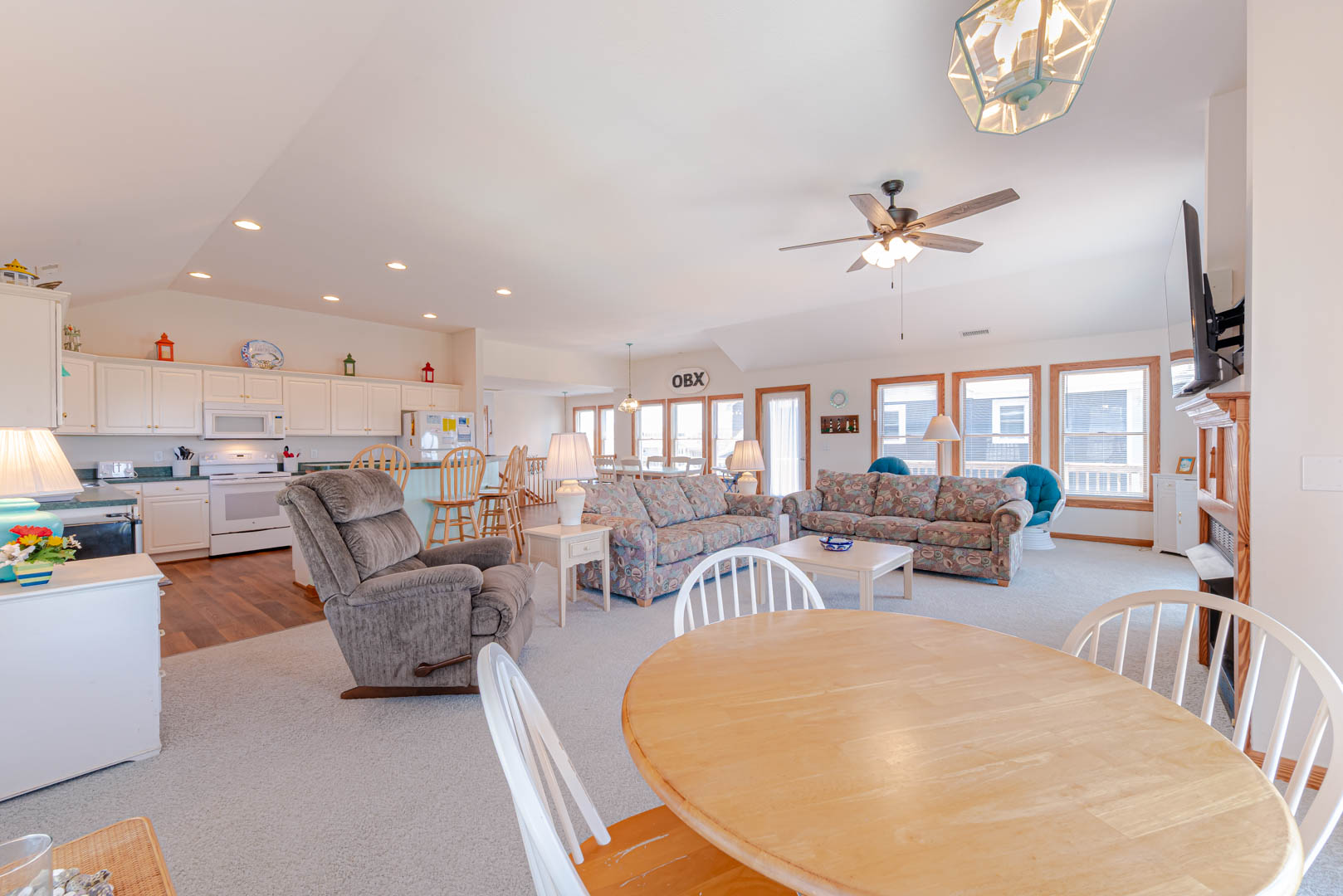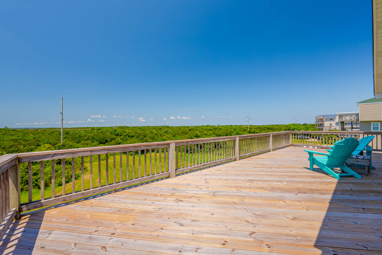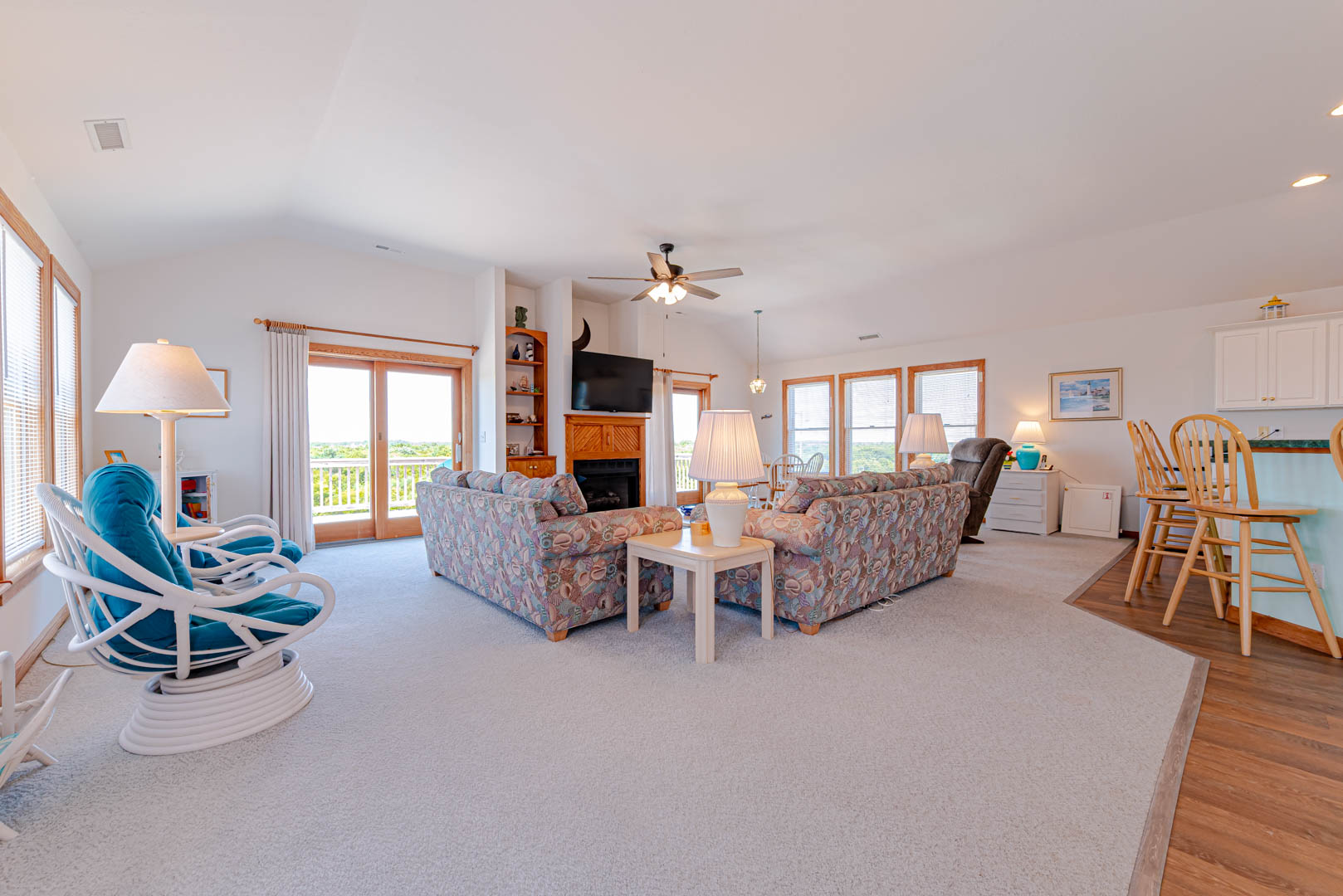 Top Level: Spacious Living/Dining/Kitchen Area, Flat Screen TV, Breakfast Bar, Half Bath, Private Suite w/King, TV, Full Bath w/Shower, and Large Wrap-Around Sun Deck w/Deck Furniture, Horizon Ocean, and Park Views.