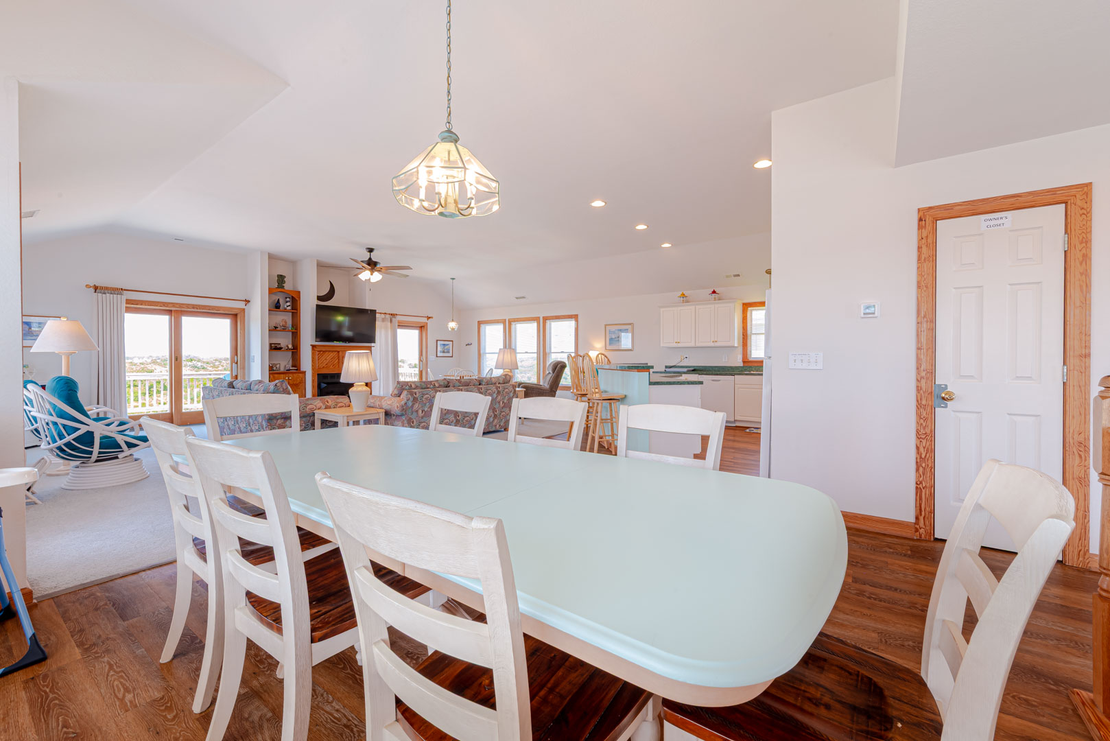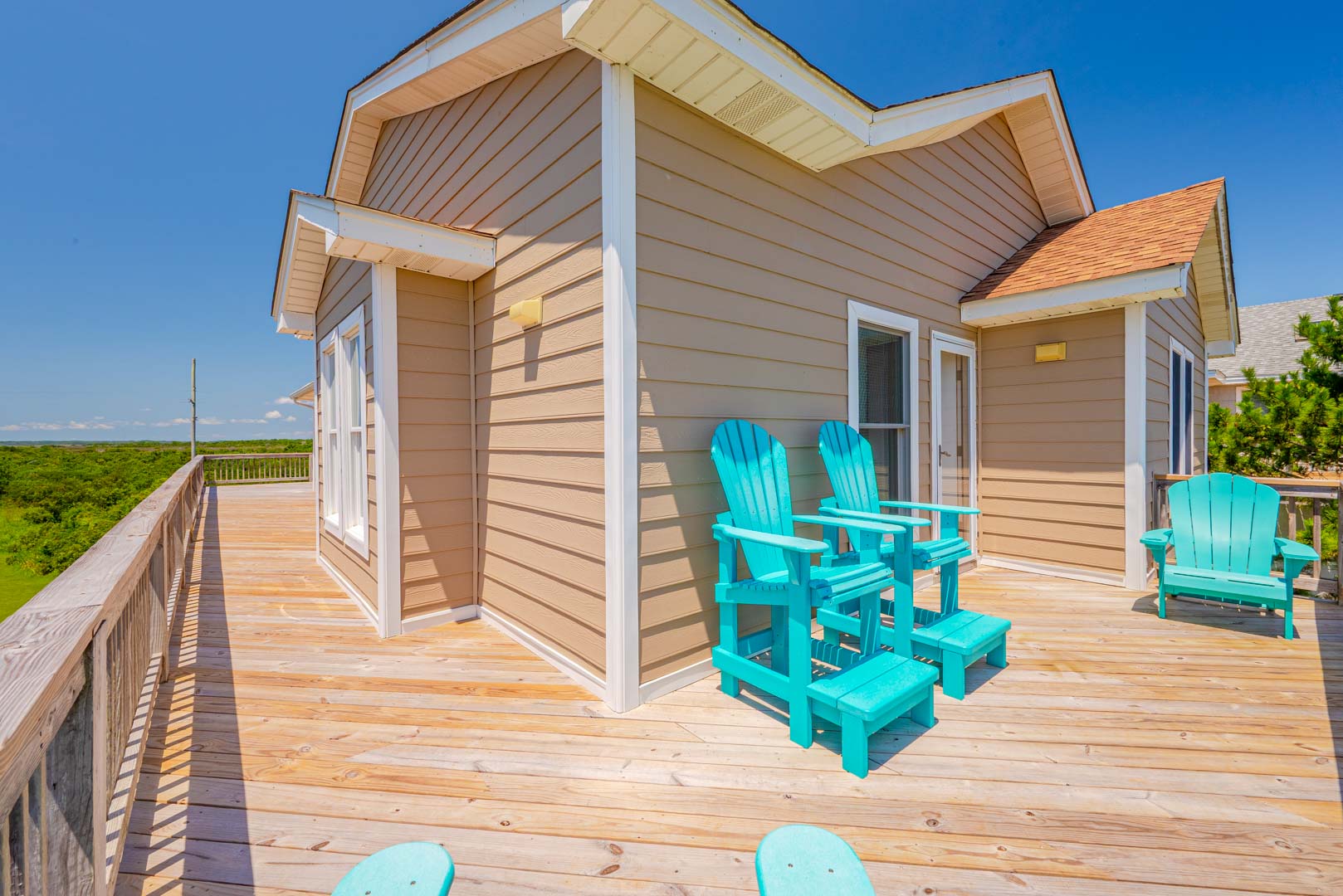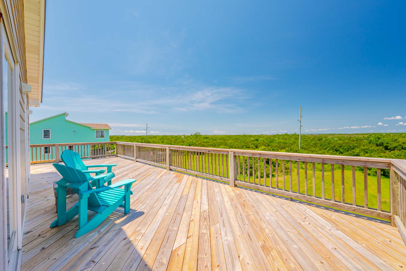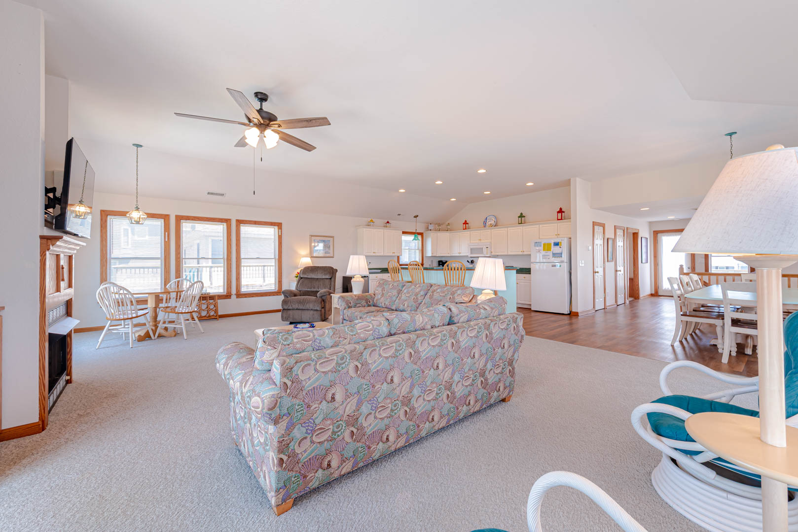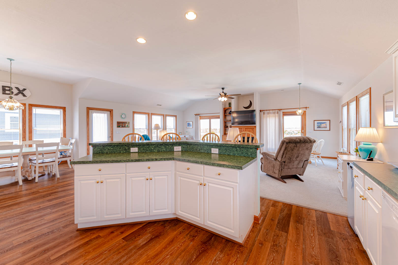 Top Level: Spacious Living/Dining/Kitchen Area, Flat Screen TV, Breakfast Bar, Half Bath, Private Suite w/King, TV, Full Bath w/Shower, and Large Wrap-Around Sun Deck w/Deck Furniture, Horizon Ocean, and Park Views.