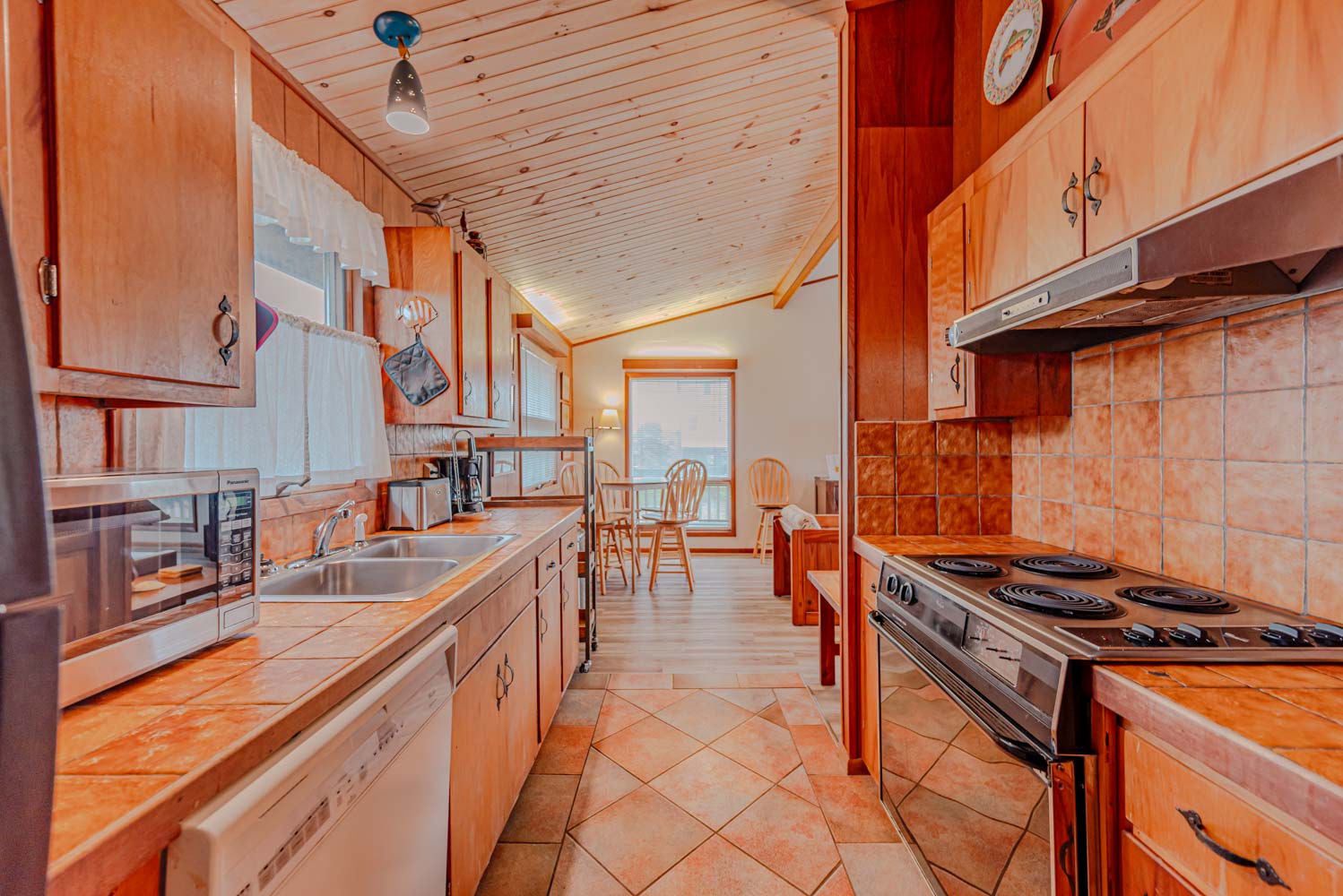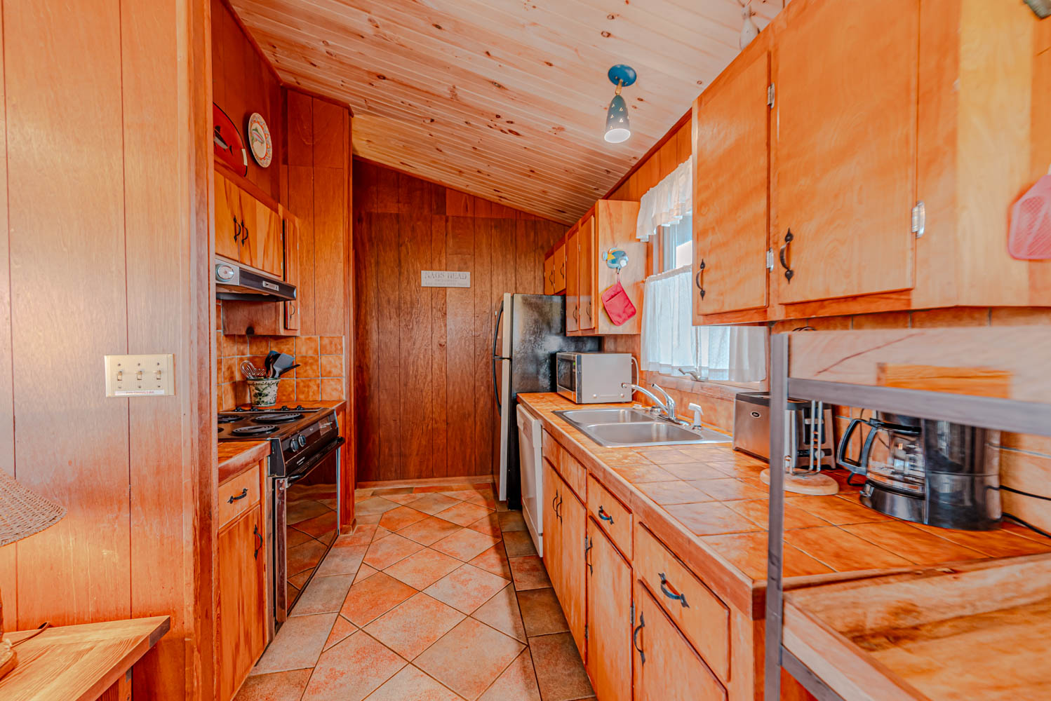 Main Level: Living/Dining/Kitchen Area, TV, Full Hall Bath w/Shower Only, 2 Bedrooms w/Queens, & Access to Wrap Around Composite Deck w/Deck Furniture.
