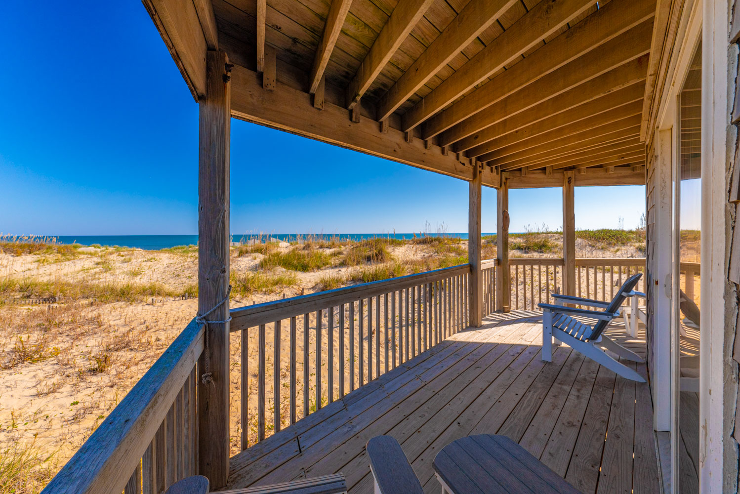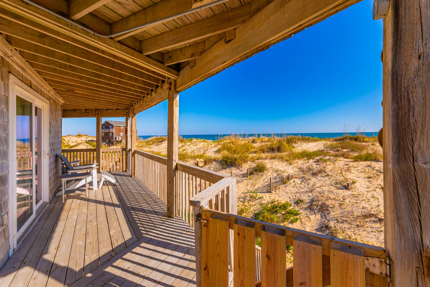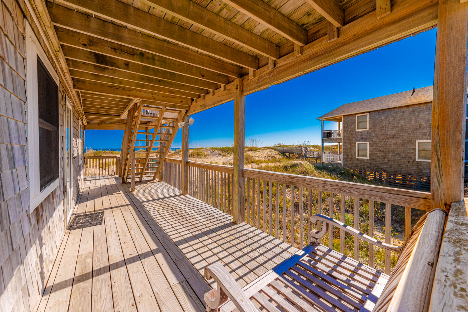 Mid-Level: Entry to Home (South Side Covered Porch), 3 Bedrooms (1 w/Queen, Slider to Covered Deck, Ocean Views; 1 w/Queen, Ocean Views, Jack-and-Jill Bath and 1 w/Queen, Slider to Covered Deck, Ocean Views; Bonus Room w/Duo Bunk (Single Over Queen), Ocean Views, Jack-n-Jill Bath; Dune Views; Adirondack Chairs, and Exterior Outlets on Covered Porch.