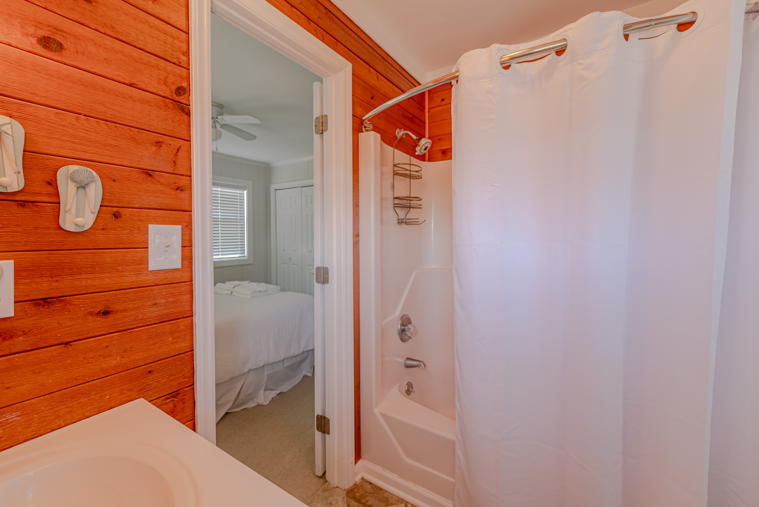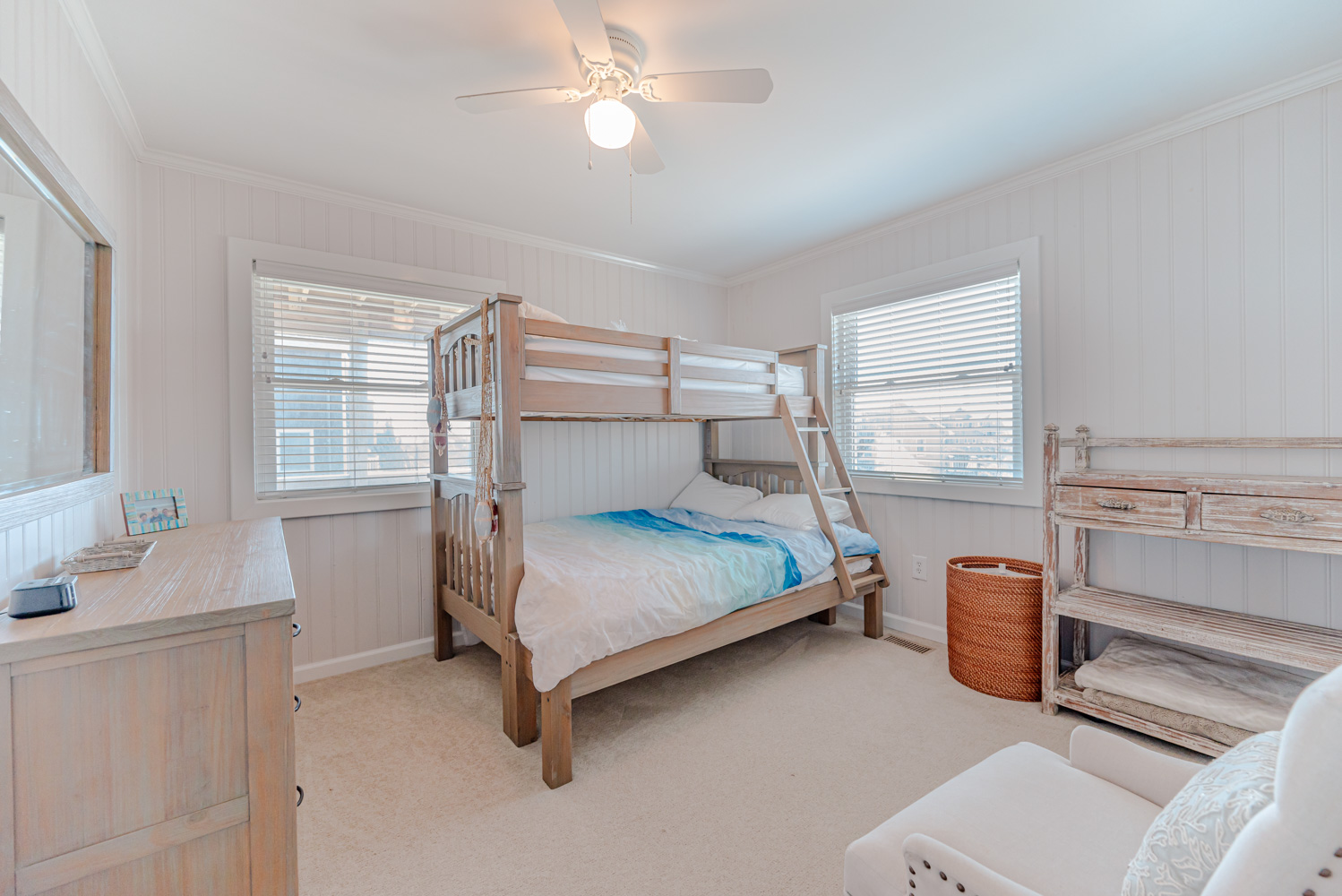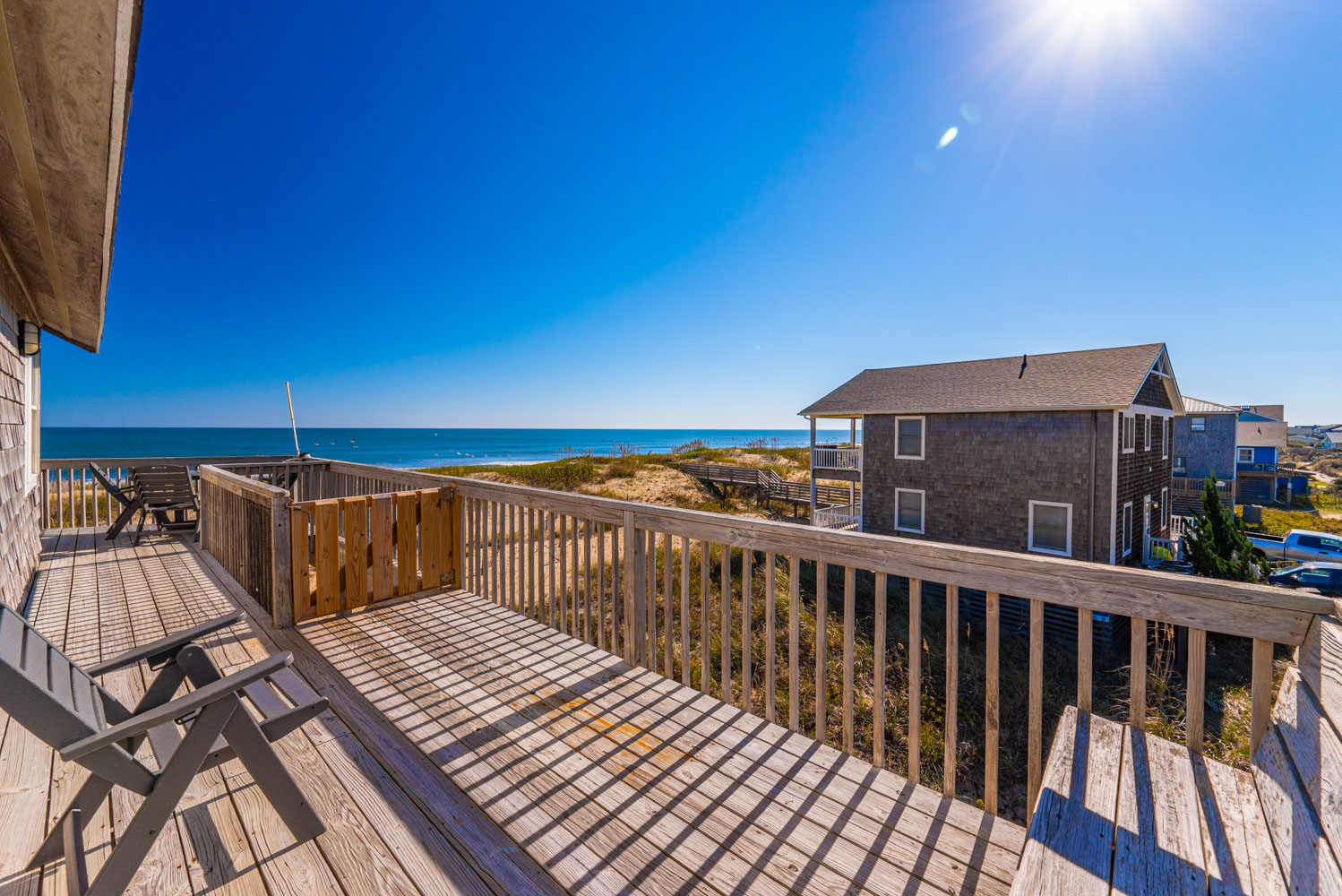 Mid-Level: Entry to Home (South Side Covered Porch), 3 Bedrooms (1 w/Queen, Slider to Covered Deck, Ocean Views; 1 w/Queen, Ocean Views, Jack-and-Jill Bath and 1 w/Queen, Slider to Covered Deck, Ocean Views; Bonus Room w/Duo Bunk (Single Over Queen), Ocean Views, Jack-n-Jill Bath; Dune Views; Adirondack Chairs, and Exterior Outlets on Covered Porch.