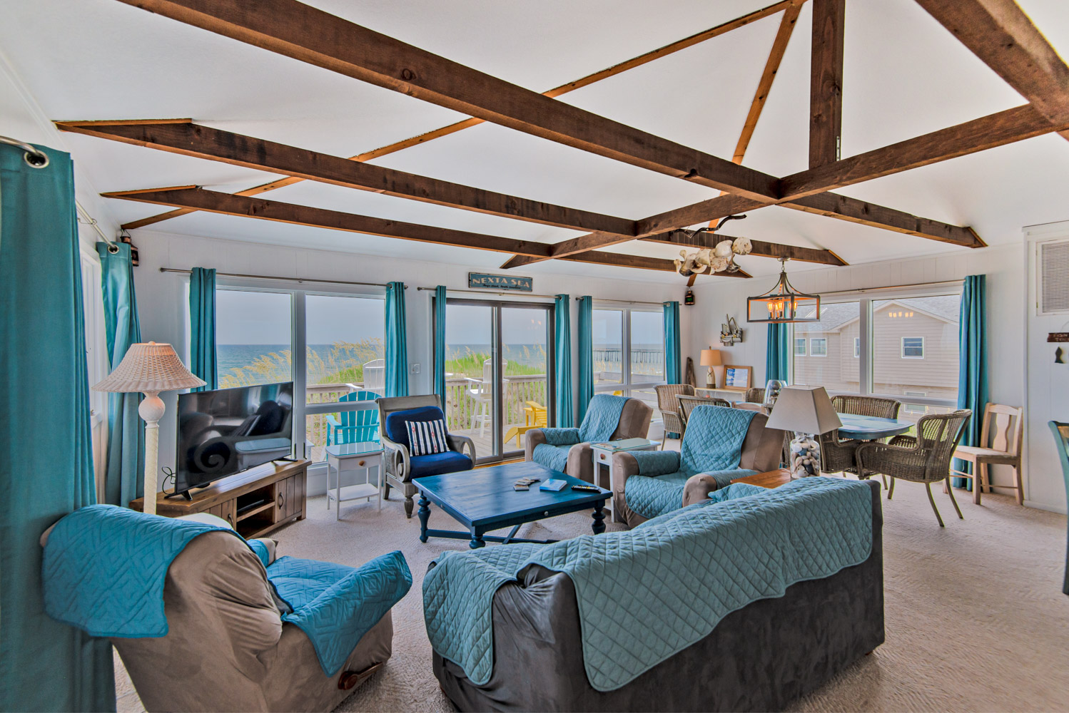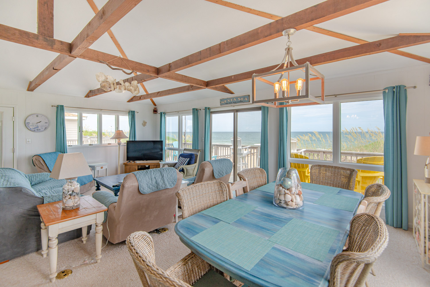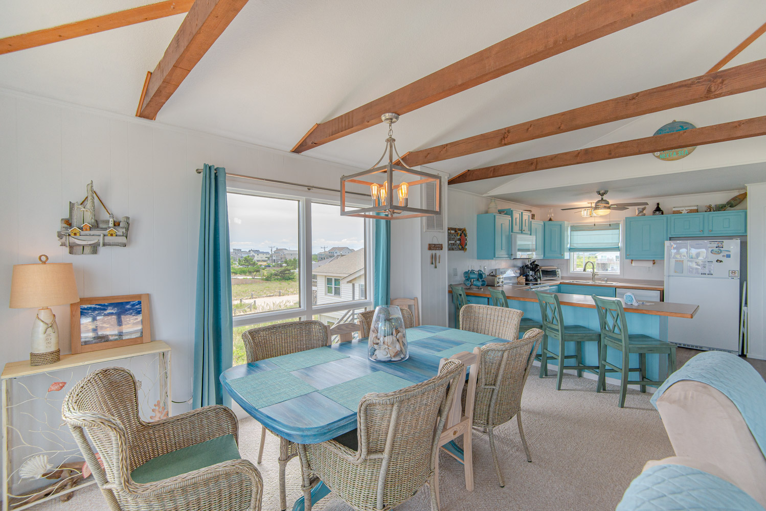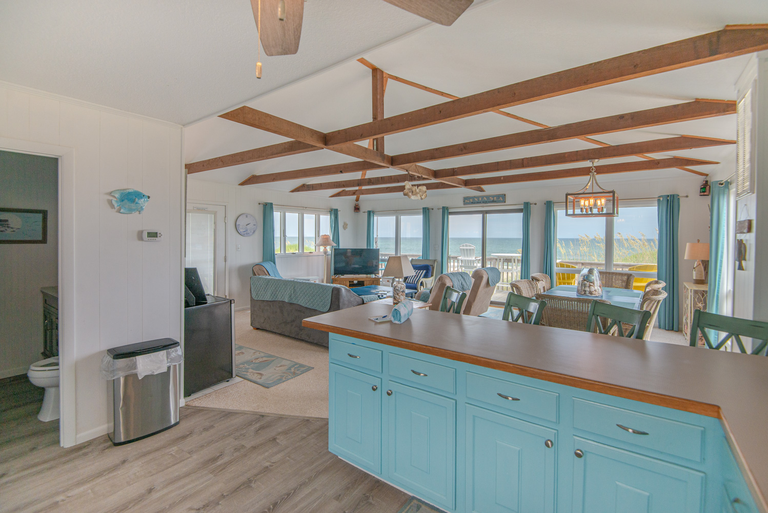 Top Level: Living Area, Flat Screen TV, Great Ocean Views, Dining Area w/Seating for Eight (8), Kitchen Area w/Bar Seating for Four (4), Full Bath w/Shower, and Access to Sun Deck w/Deck Furniture.