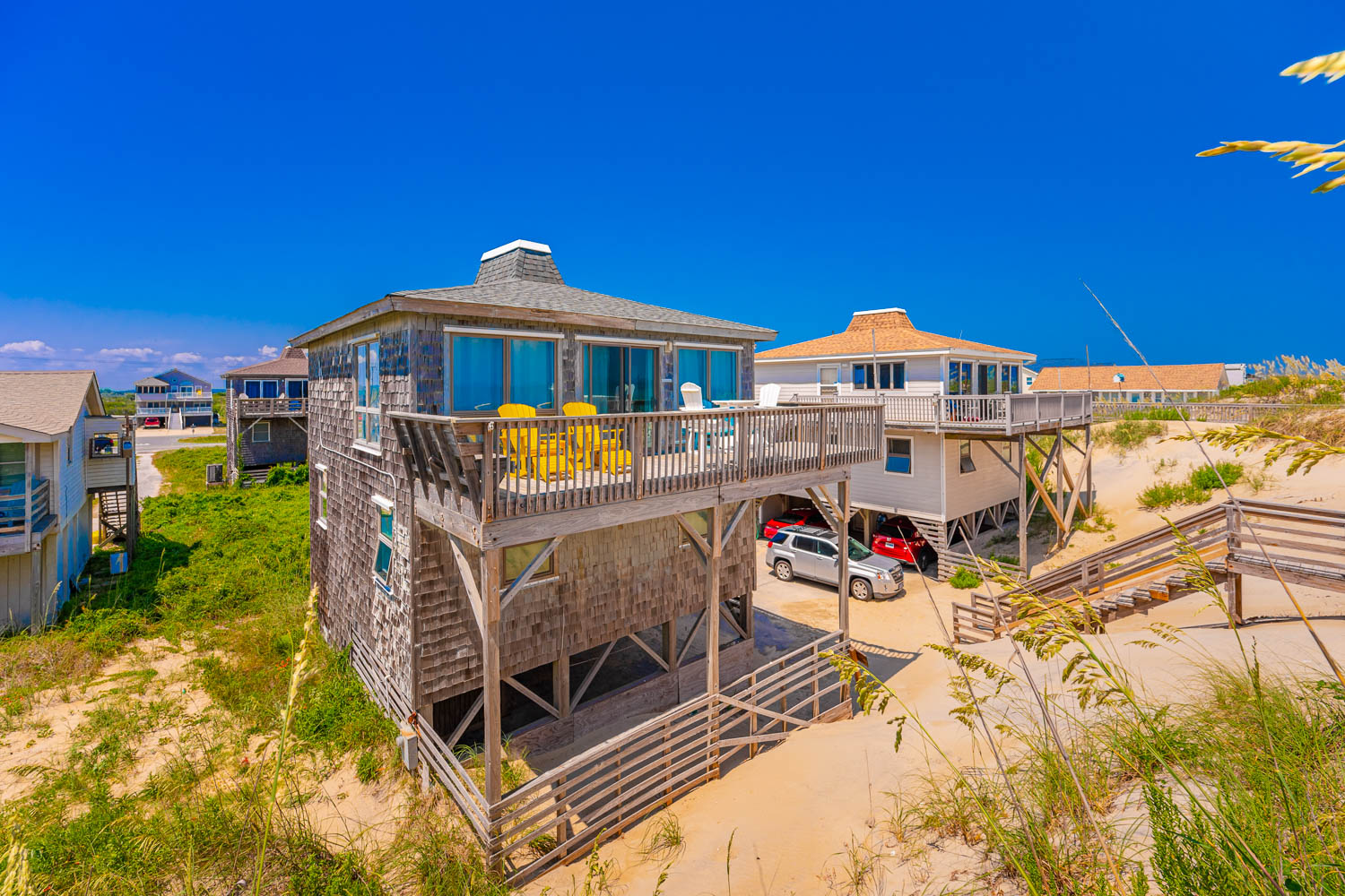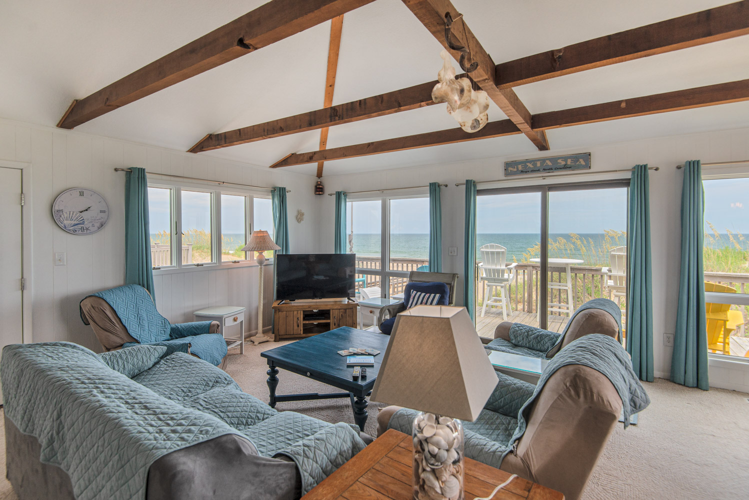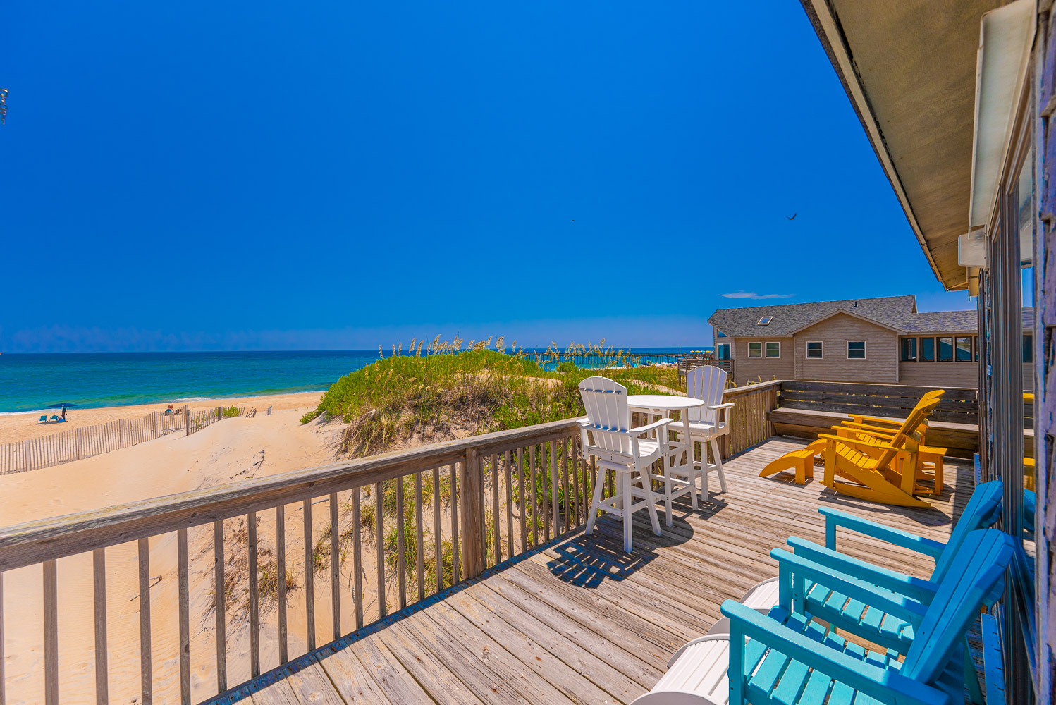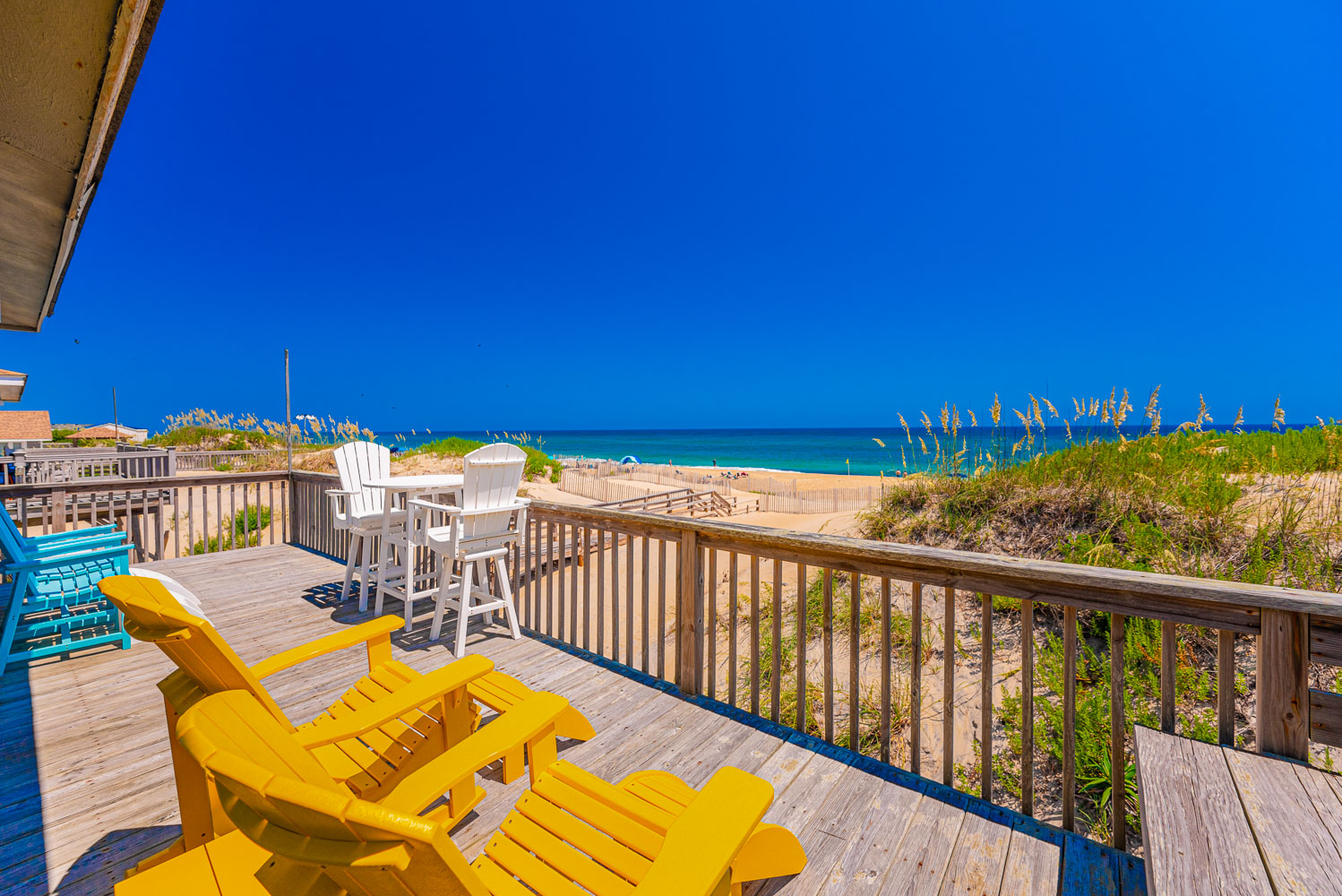 Top Level: Living Area, Flat Screen TV, Great Ocean Views, Dining Area w/Seating for Eight (8), Kitchen Area w/Bar Seating for Four (4), Full Bath w/Shower, and Access to Sun Deck w/Deck Furniture.
