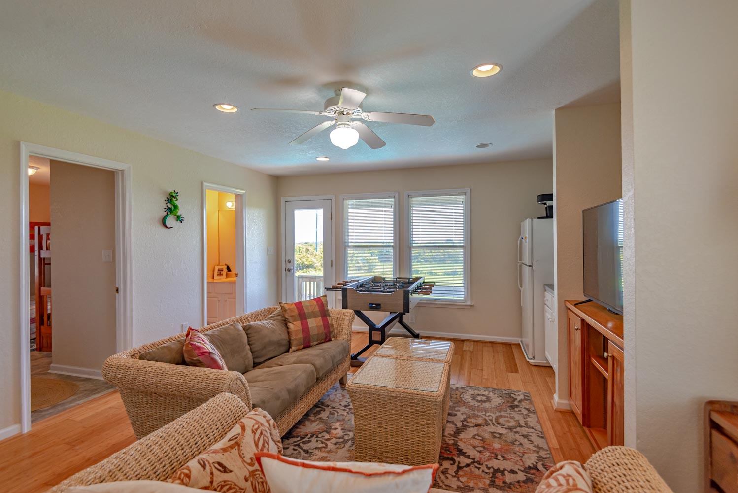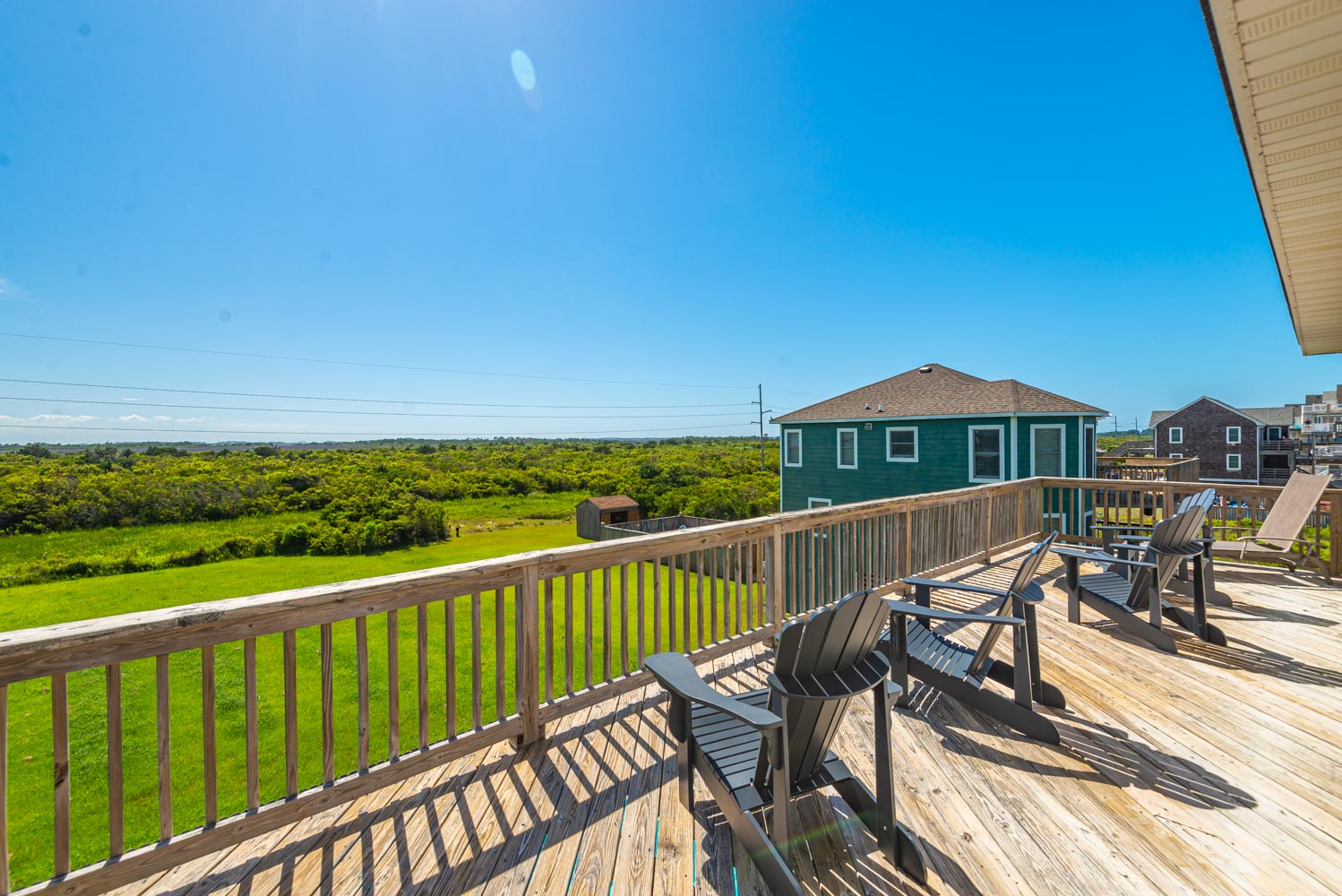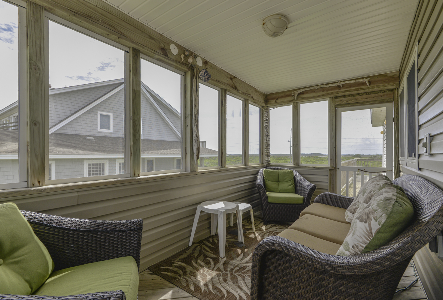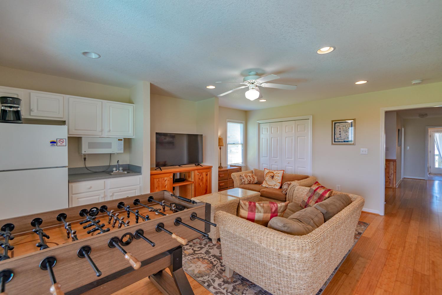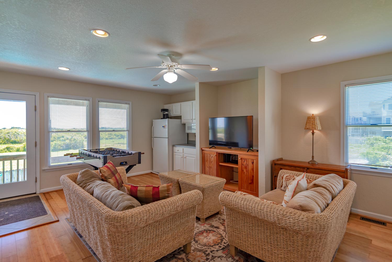 Top Level: Living Room w/50 Inch Flat Screen HDTV, DVD, Wet Bar w/Full Size Refrigerator, Half Bath, Dining Area w/Seating for 14, Kitchen Area, Screen Porch w/Furniture, 2 Bedrooms (2 Private Suites w/Kings, Flat Screen HDTVs, & Full Baths w/Tub & Shower), West Facing Sun Deck w/Deck Furniture & Sound Views, & East Facing Sun Deck w/Deck Furniture & Ocean Views.