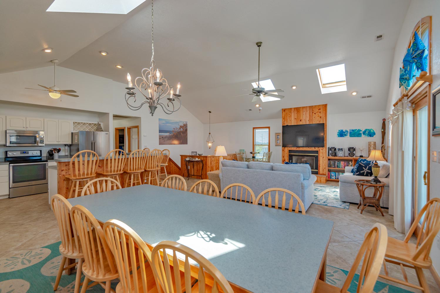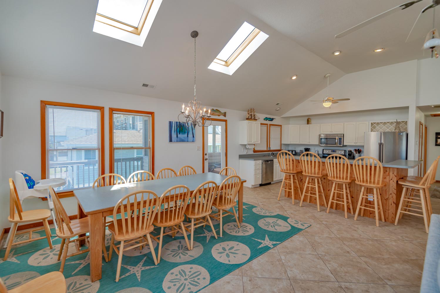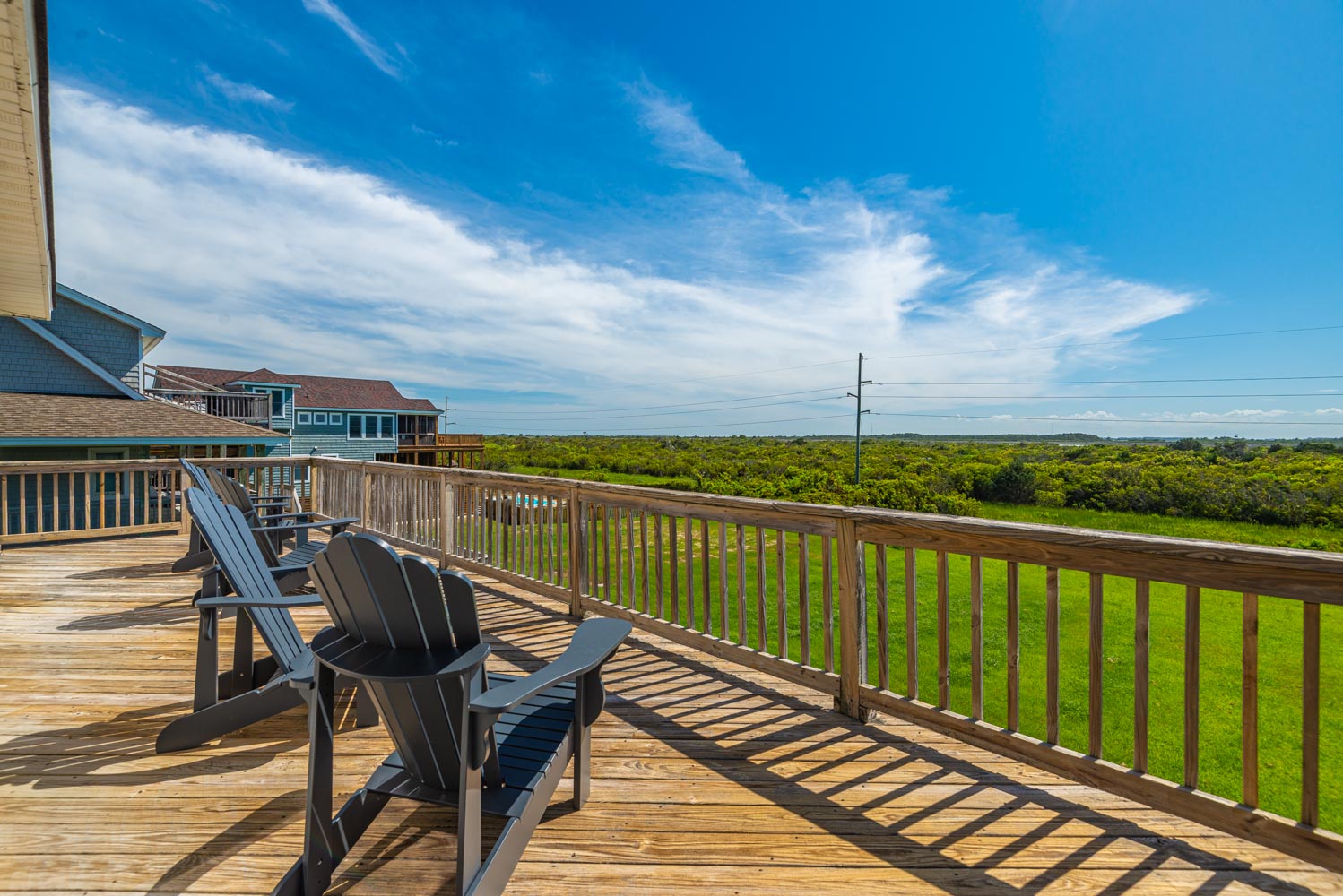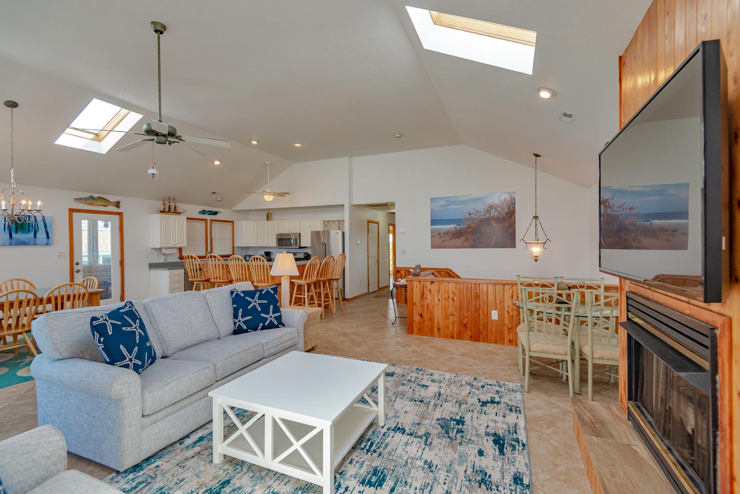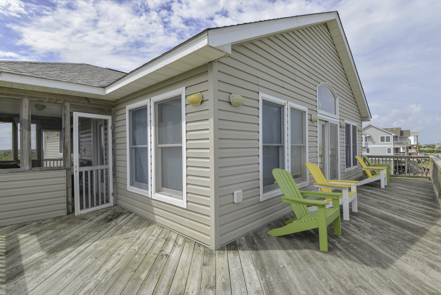 Top Level: Living Room w/50 Inch Flat Screen HDTV, DVD, Wet Bar w/Full Size Refrigerator, Half Bath, Dining Area w/Seating for 14, Kitchen Area, Screen Porch w/Furniture, 2 Bedrooms (2 Private Suites w/Kings, Flat Screen HDTVs, & Full Baths w/Tub & Shower), West Facing Sun Deck w/Deck Furniture & Sound Views, & East Facing Sun Deck w/Deck Furniture & Ocean Views.
