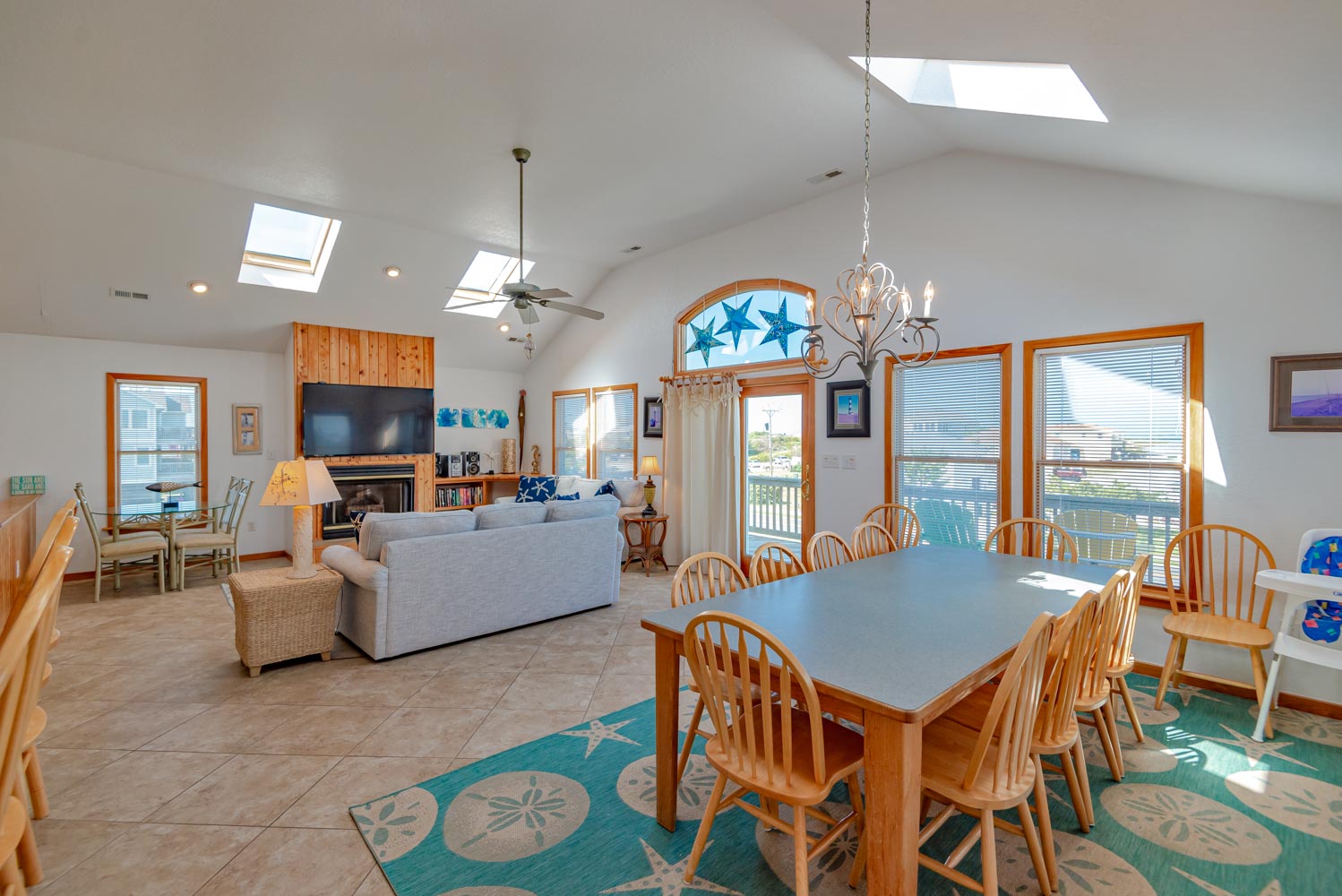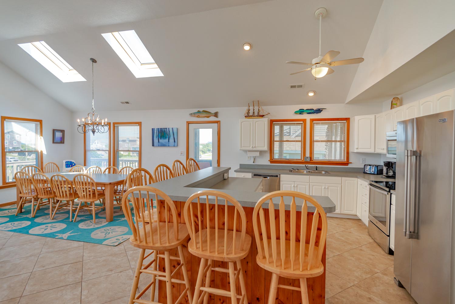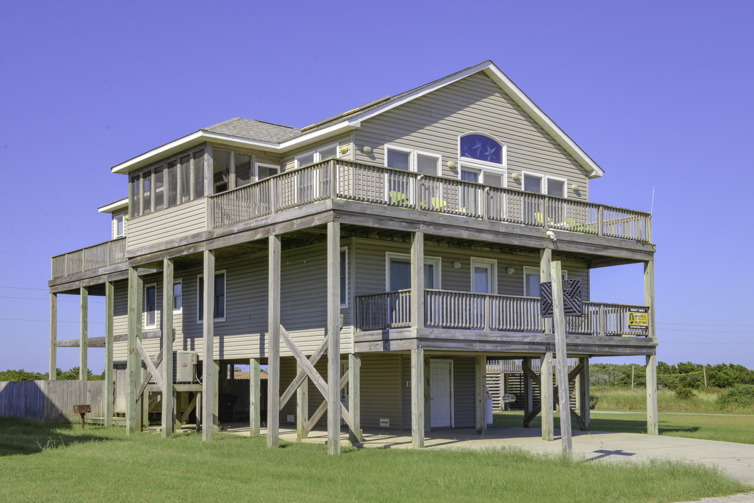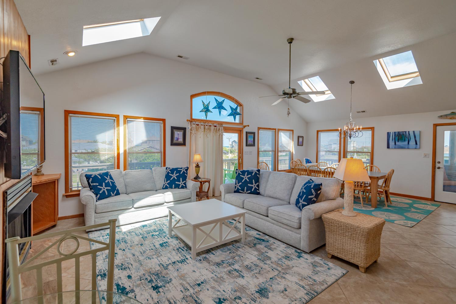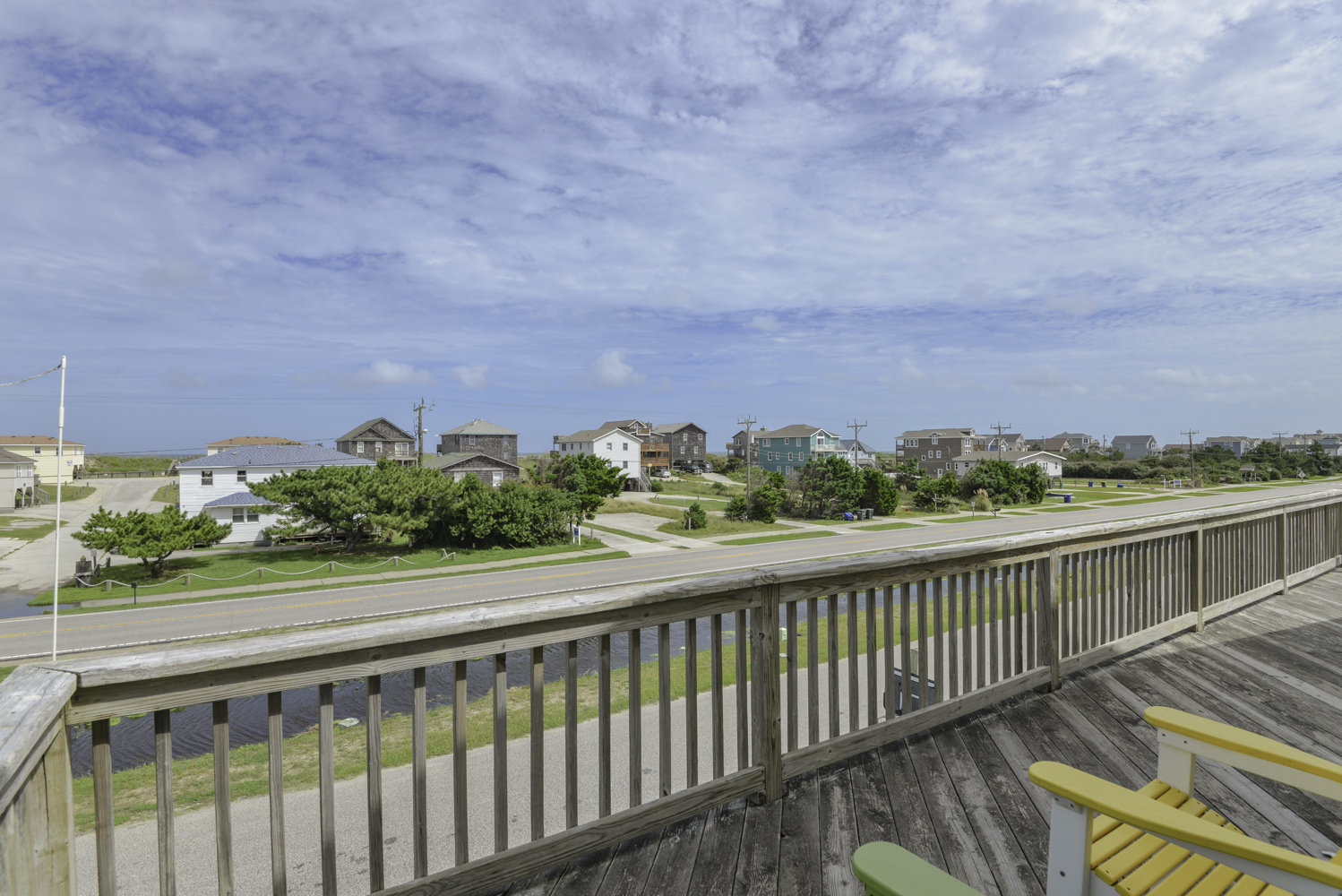 Top Level: Living Room w/50 Inch Flat Screen HDTV, DVD, Wet Bar w/Full Size Refrigerator, Half Bath, Dining Area w/Seating for 14, Kitchen Area, Screen Porch w/Furniture, 2 Bedrooms (2 Private Suites w/Kings, Flat Screen HDTVs, & Full Baths w/Tub & Shower), West Facing Sun Deck w/Deck Furniture & Sound Views, & East Facing Sun Deck w/Deck Furniture & Ocean Views.