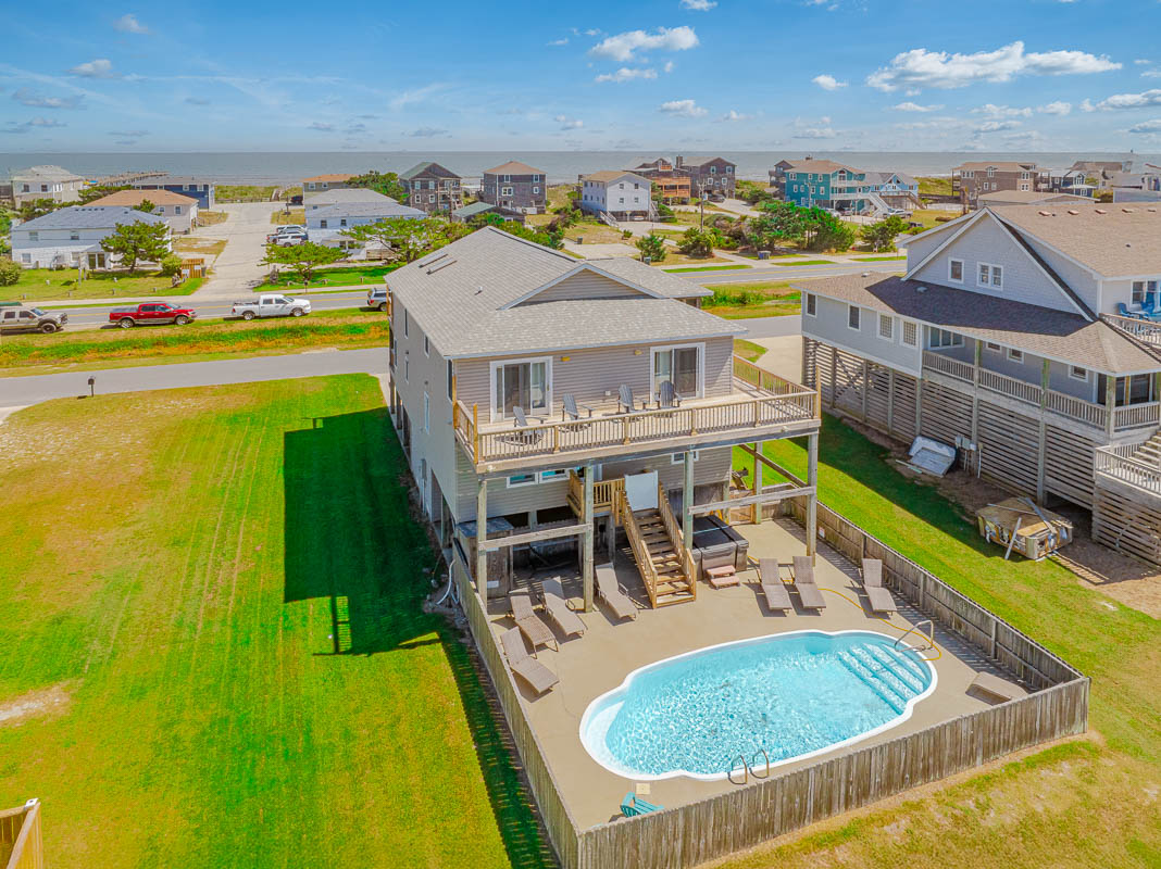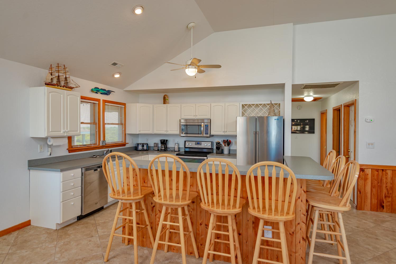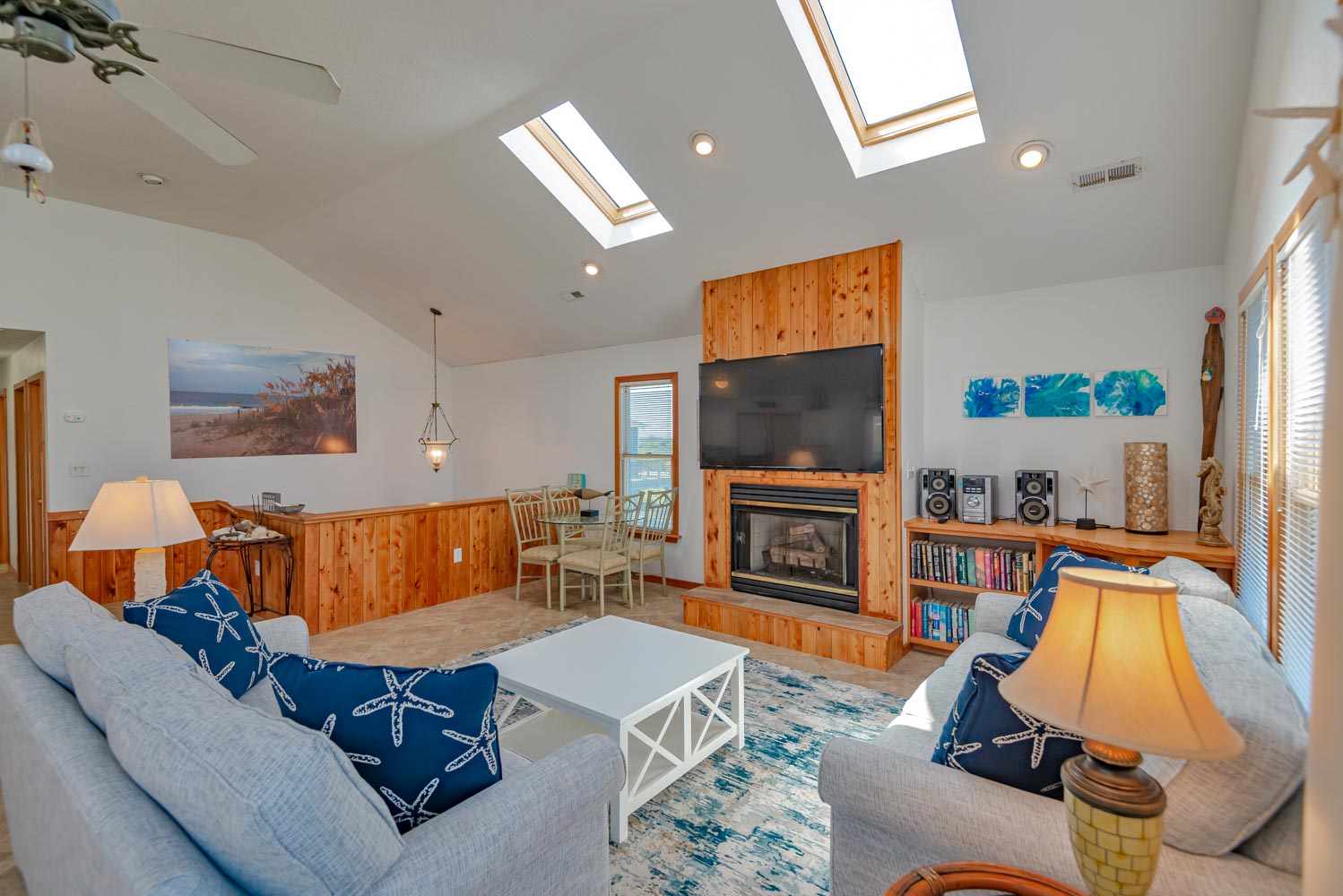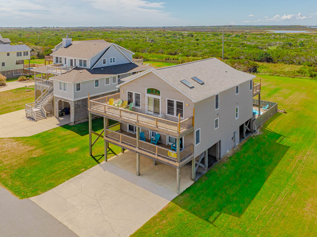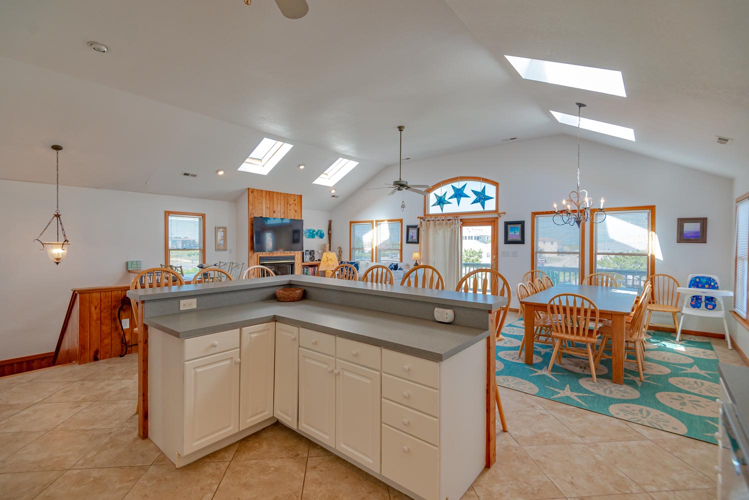 Top Level: Living Room w/50 Inch Flat Screen HDTV, DVD, Wet Bar w/Full Size Refrigerator, Half Bath, Dining Area w/Seating for 14, Kitchen Area, Screen Porch w/Furniture, 2 Bedrooms (2 Private Suites w/Kings, Flat Screen HDTVs, & Full Baths w/Tub & Shower), West Facing Sun Deck w/Deck Furniture & Sound Views, & East Facing Sun Deck w/Deck Furniture & Ocean Views.