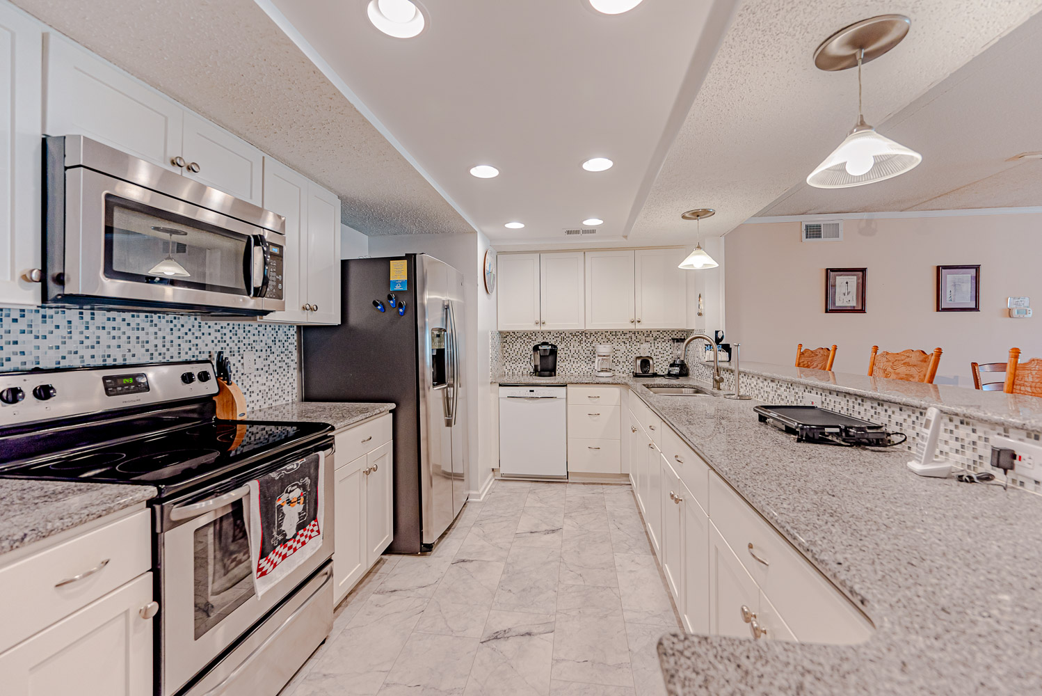 Main Level: Living Area w/50-inch HD Flat Screen TV, & Large East Facing Windows, Fully Stocked Kitchen w/ Granite Countertops, Stainless Steel Appliances, Bar Seating for Four (4), Dining Area w/Seating for Eight (8), Full Hall Bath w/Shower Only, 3 Bedrooms (Private Suite w/King, TV, & Full Bath w/Jetted Tub, Separate Shower, & Dual Vanity, 1w/Double, Bunk Set, & Flat Screen TV, 1 w/Queen & Flat Screen TV), & Covered Porch w/Table & Ample Seating.