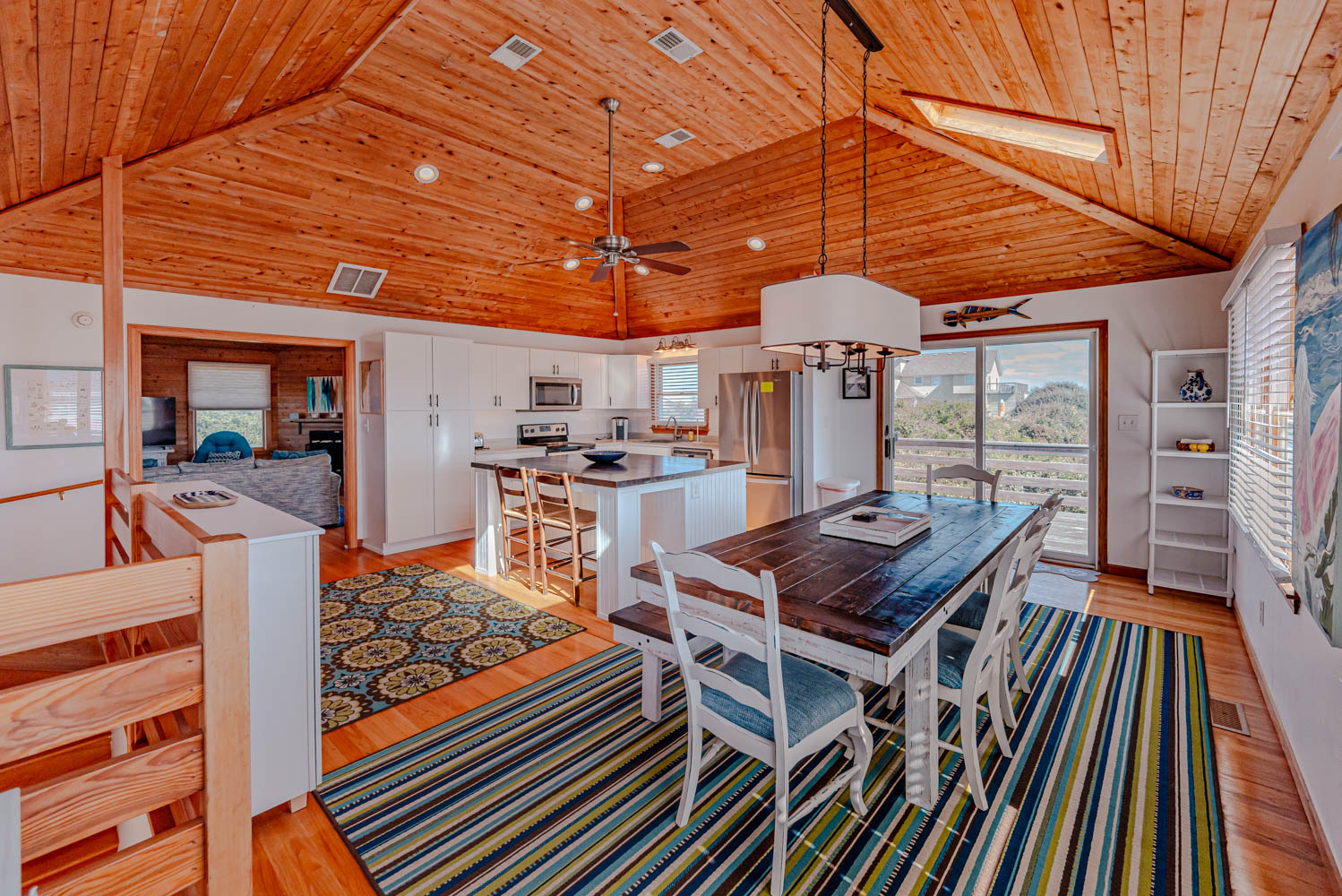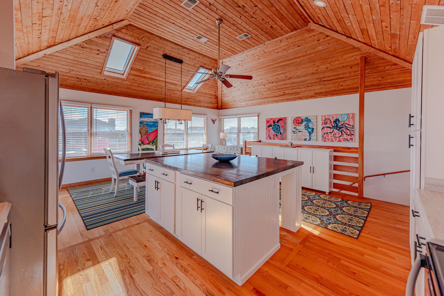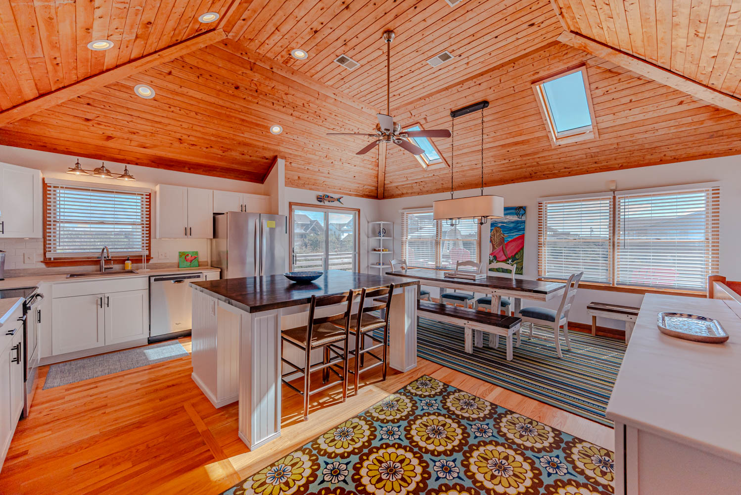 Top Level: Kitchen Area, Island Bar Seating, Large Dining Area, Seating for Eight (8), Living Area, Large TV, Vaulted Ceilings, Hardwood Floors, Wet Bar, Beverage Cooler; Half Bath; Large Sun Deck w/Deck Furniture and Horizon Ocean Views.