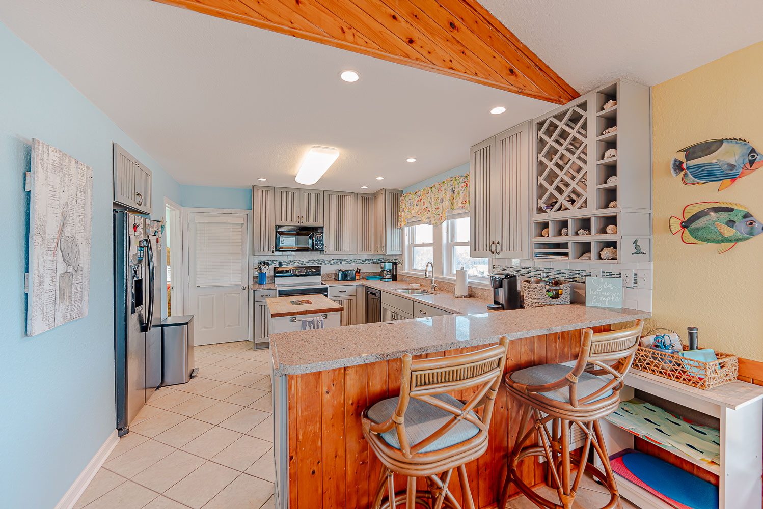 Mid Level: Beautifully Decorated Living w/TV, DVD, Great Ocean Views, Fully Equipped Kitchen w/Bar Seating for Two (2), Dining Area w/Seating for Six (6), Bedroom w/Queen & TV, Full Hall Bath w/Walk-In Shower, Front Covered Deck w/Deck Furniture, Back Covered Deck w/Deck Furniture, & Sun Deck w/Picnic Table & Ocean Views.