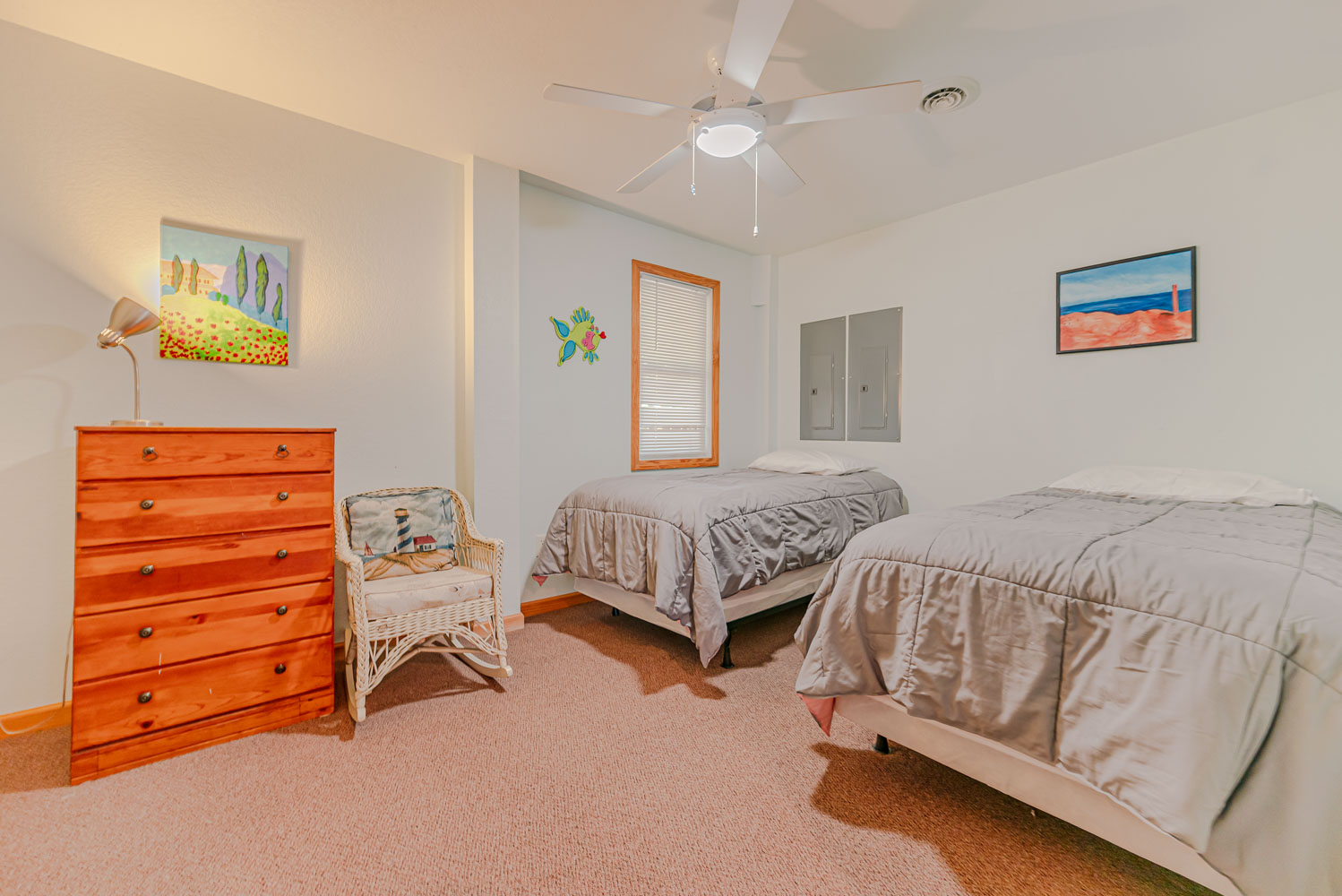 Mid Level: 3 Bedrooms (Private Suite w/King, TV, Full Bath; 1 w/Queen, TV; 1 w/2 Singles, TV), Shared Full Bath, and Wrap-Around Covered Deck.