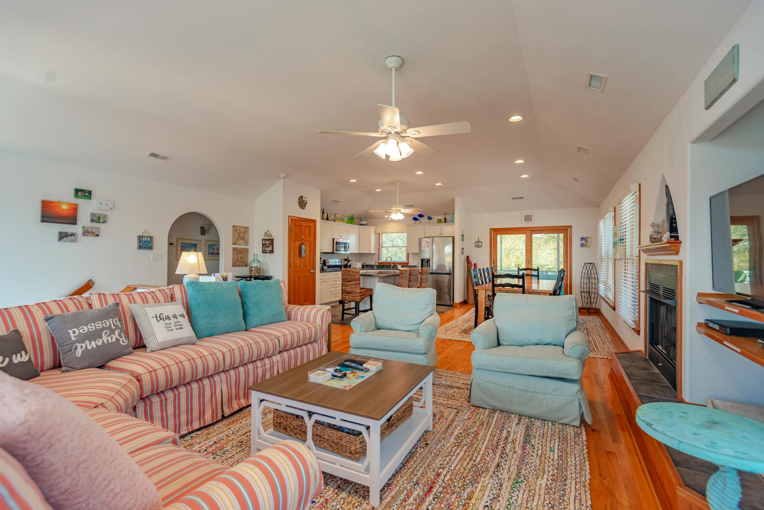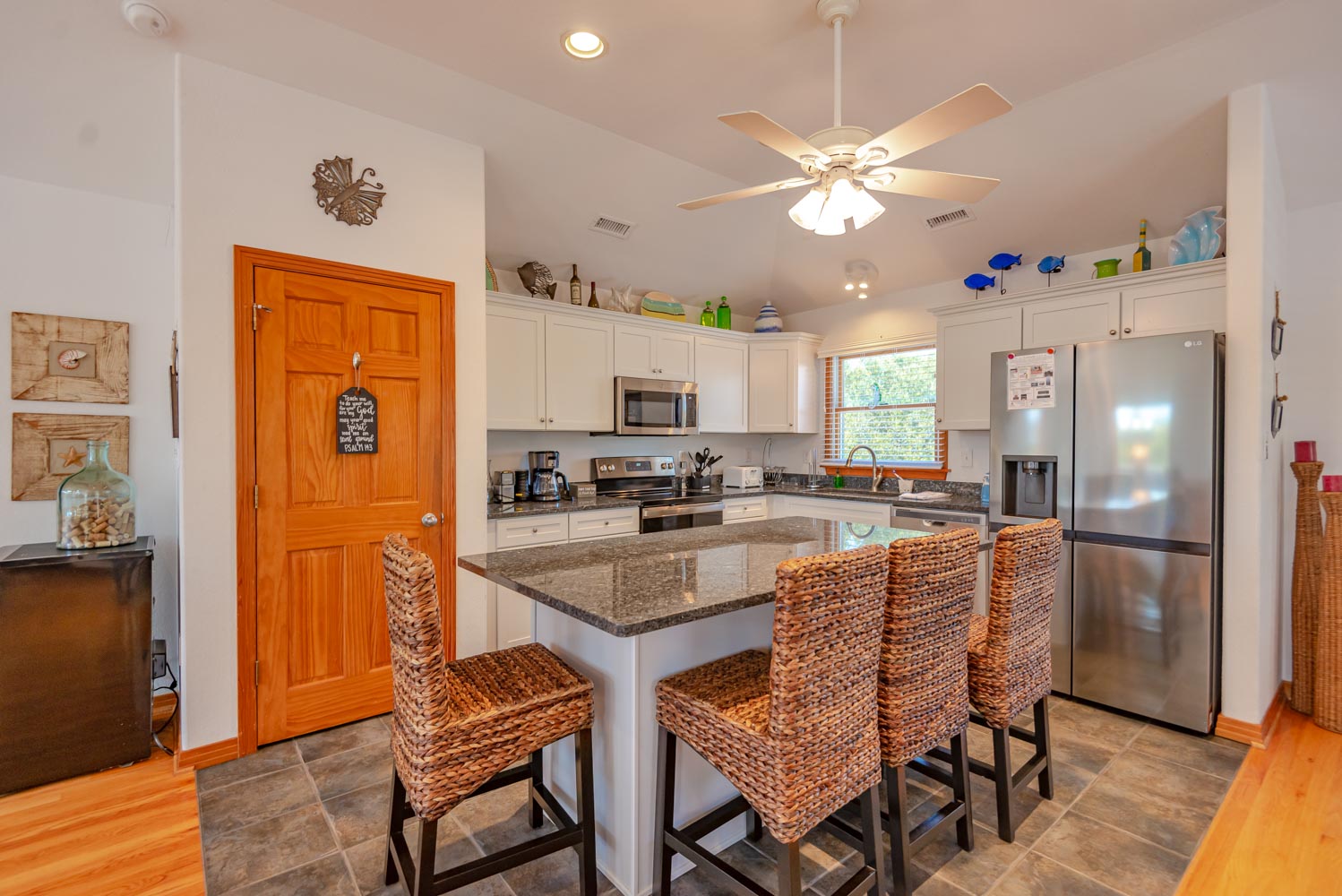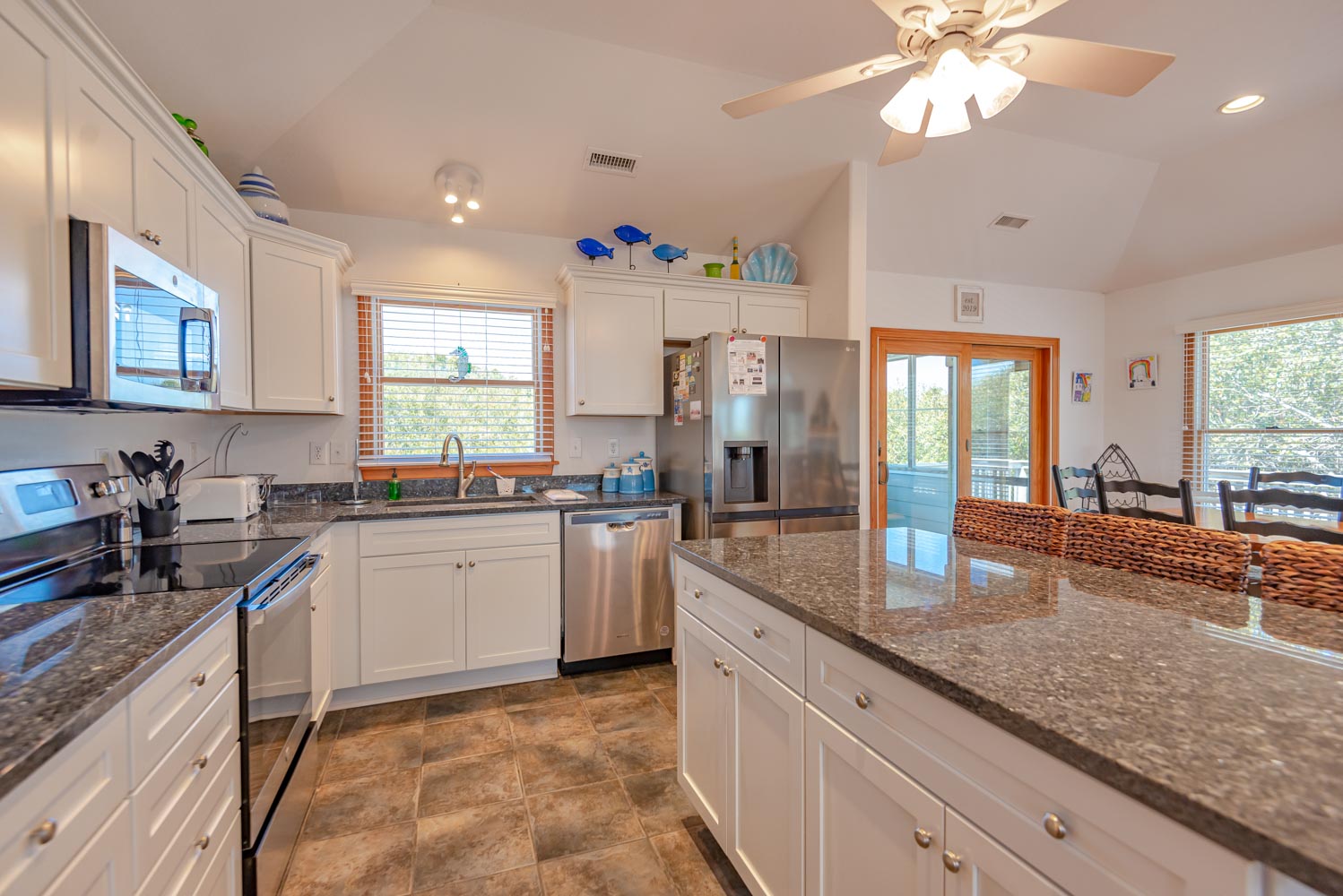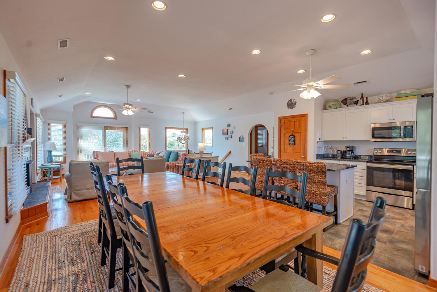 Top Level: Living Area, Hardwood, Tile Floors, Large Flat Screen TV, Cathedral Ceilings, Well Equipped Kitchen, Stainless Steel Appliances, Wine/Beverage Refrigerator, Island Bar w/Seating for Four(4), Breakfast Bar, Granite Counters, Large Dining Table w/Seating for Ten(1); Half Bath; Private Suite w/King, TV, Full Bath w/Whirlpool Tub and Shower; Screen Porch, and Sun Deck w/Deck Furniture.
