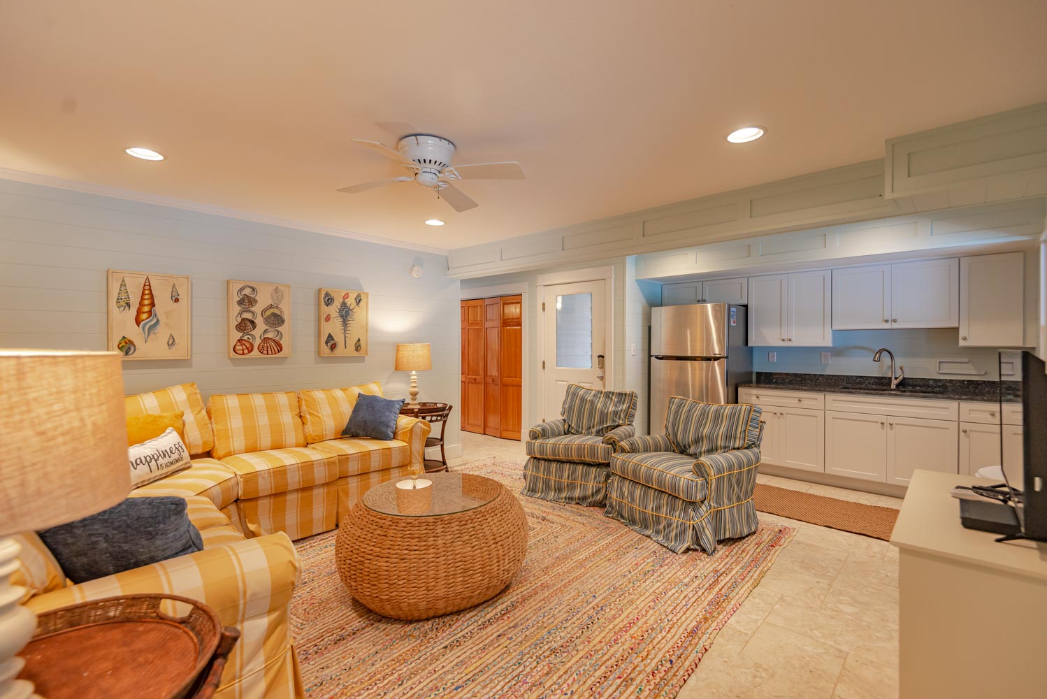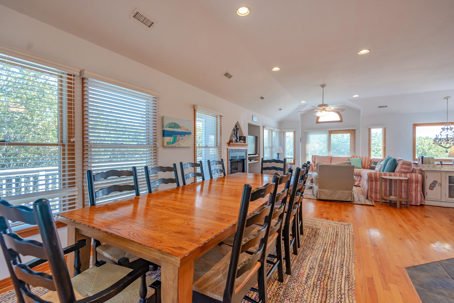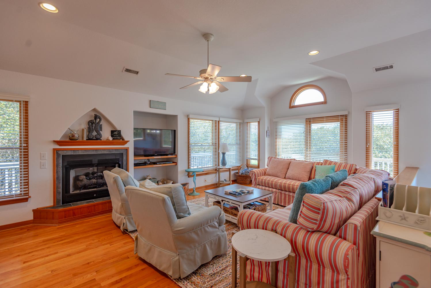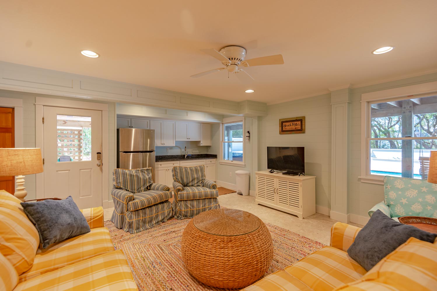 Top Level: Living Area, Hardwood, Tile Floors, Large Flat Screen TV, Cathedral Ceilings, Well Equipped Kitchen, Stainless Steel Appliances, Wine/Beverage Refrigerator, Island Bar w/Seating for Four(4), Breakfast Bar, Granite Counters, Large Dining Table w/Seating for Ten(1); Half Bath; Private Suite w/King, TV, Full Bath w/Whirlpool Tub and Shower; Screen Porch, and Sun Deck w/Deck Furniture.