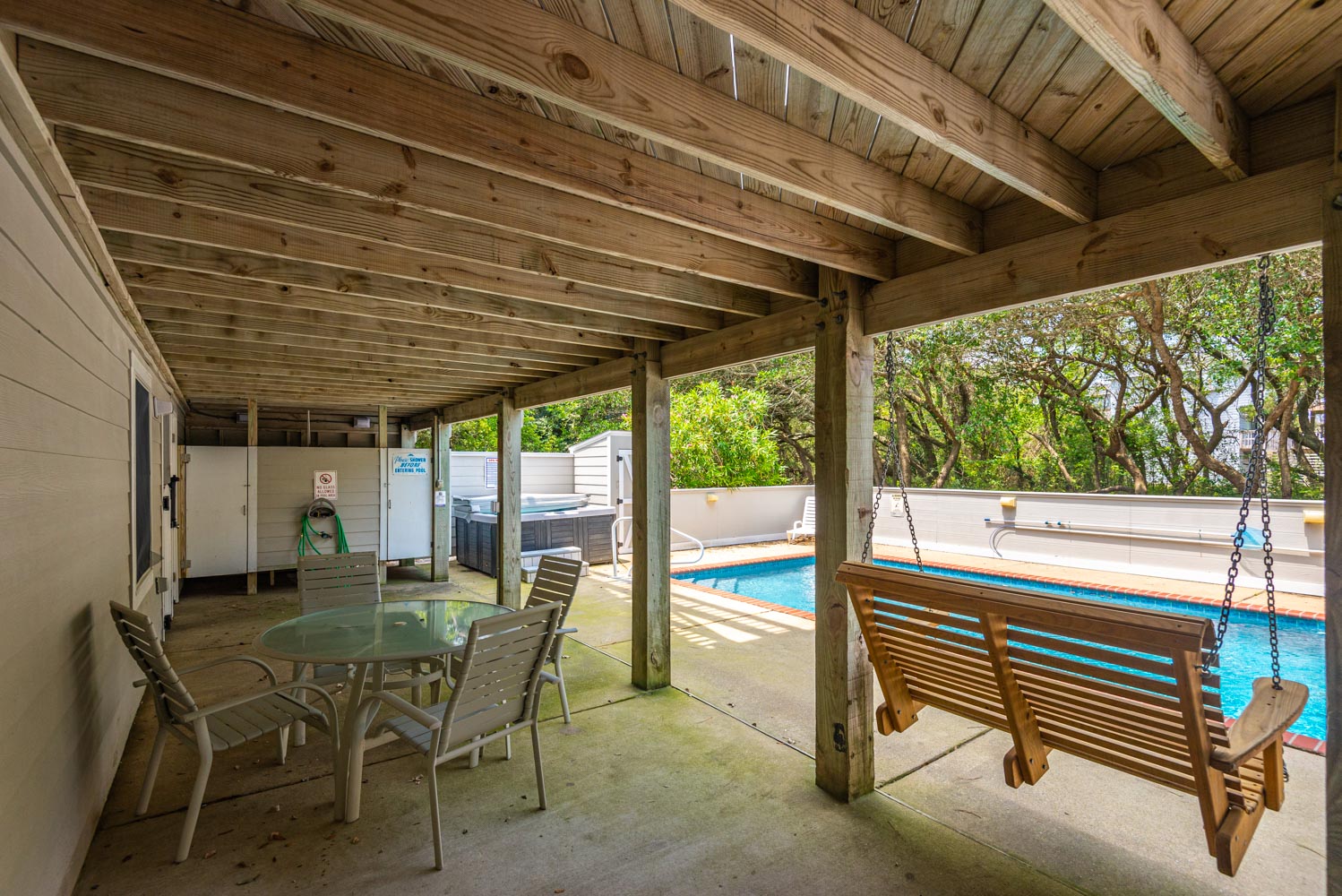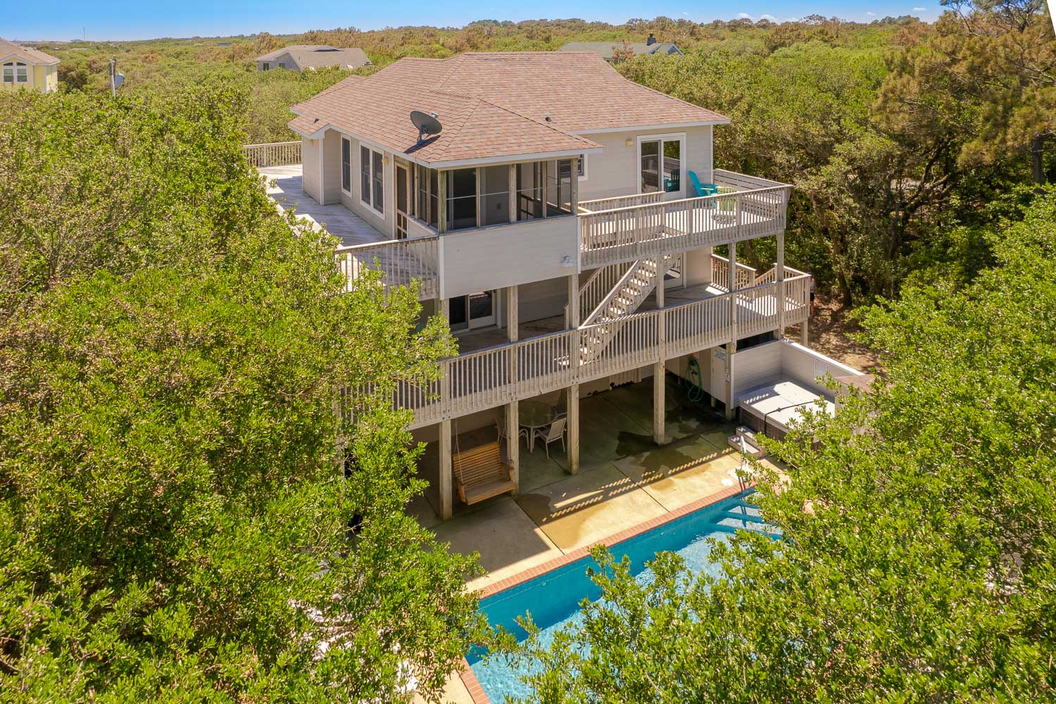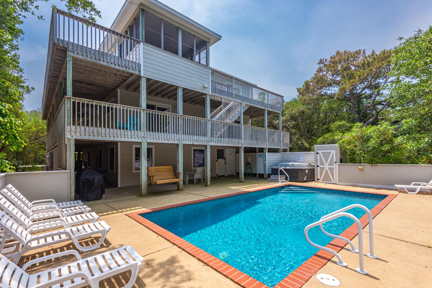 Ground Level: Parking for 5 Cars, Basketball Hoop, Covered Entry, Den, TV, Tile Floors, Wet Bar, Full Size Refrigerator, Laundry Area, Bedroom w/2 Bunk Sets, Full Bath w/Tub/Shower, Access to Covered Sitting Area, Gas Grill, Enclosed Outside Double Shower, Half Bath, and Access to Private Swimming Pool- Open Seasonally and Hot Tub.