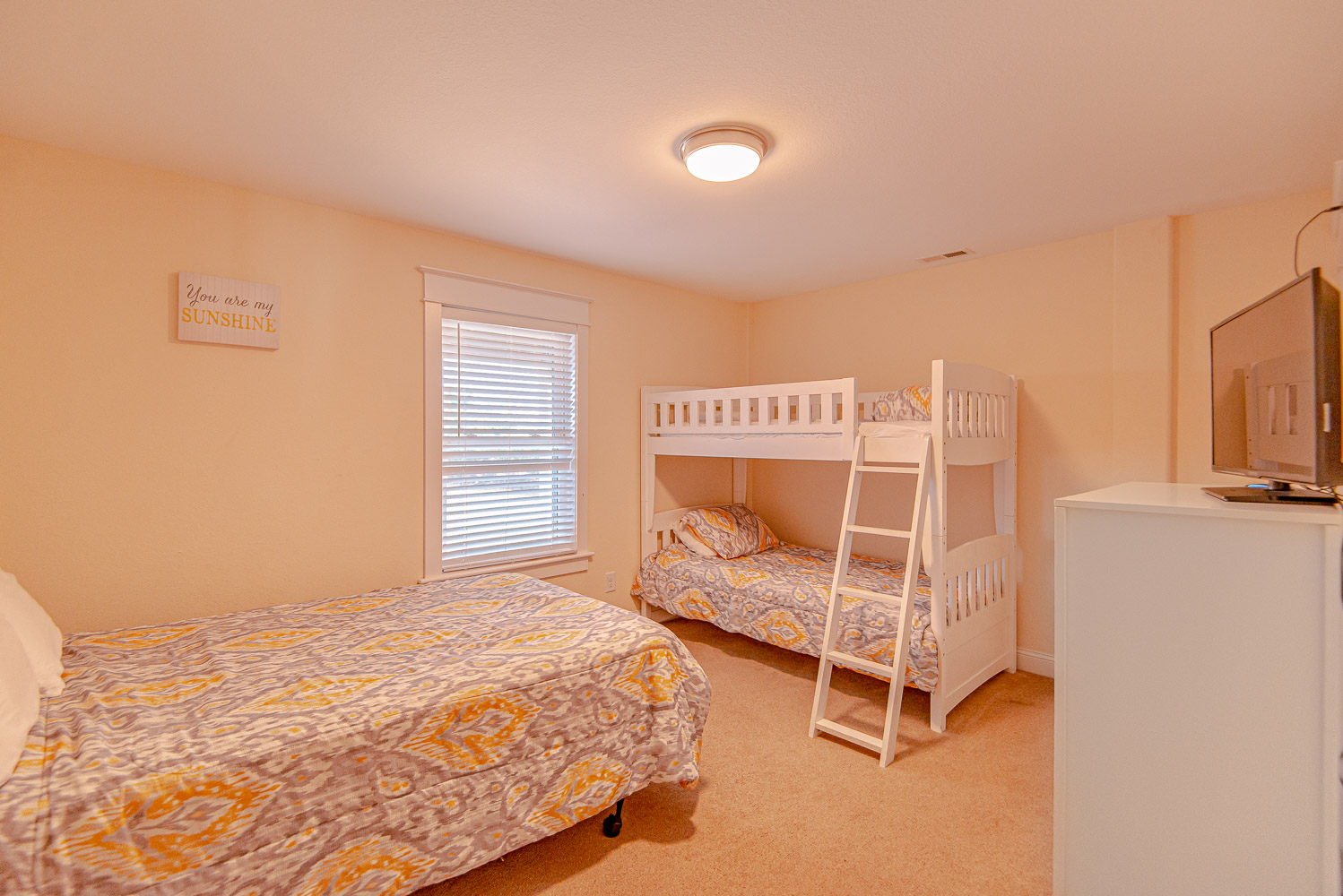 Mid Level: 4 Bedrooms (Private Suite w/King, TV, Full Bath; 2 w/Kings, TVs, Shared Full Bath, 1 w/King, TV), Full Hall Bath, Den w/TV, and 2 Covered Deck.