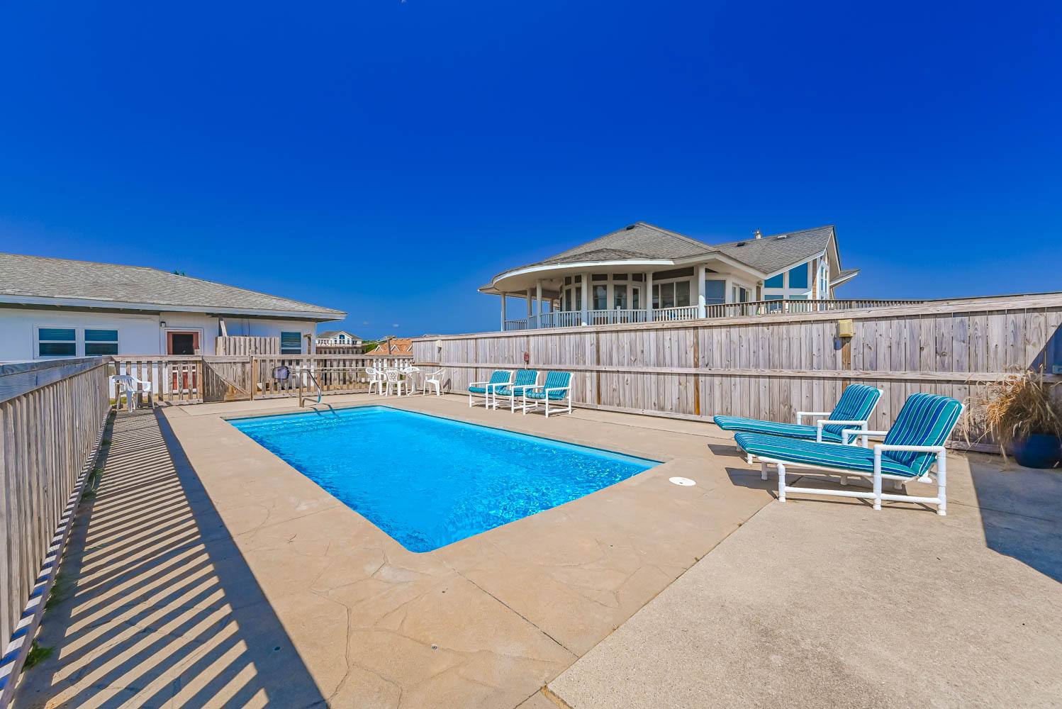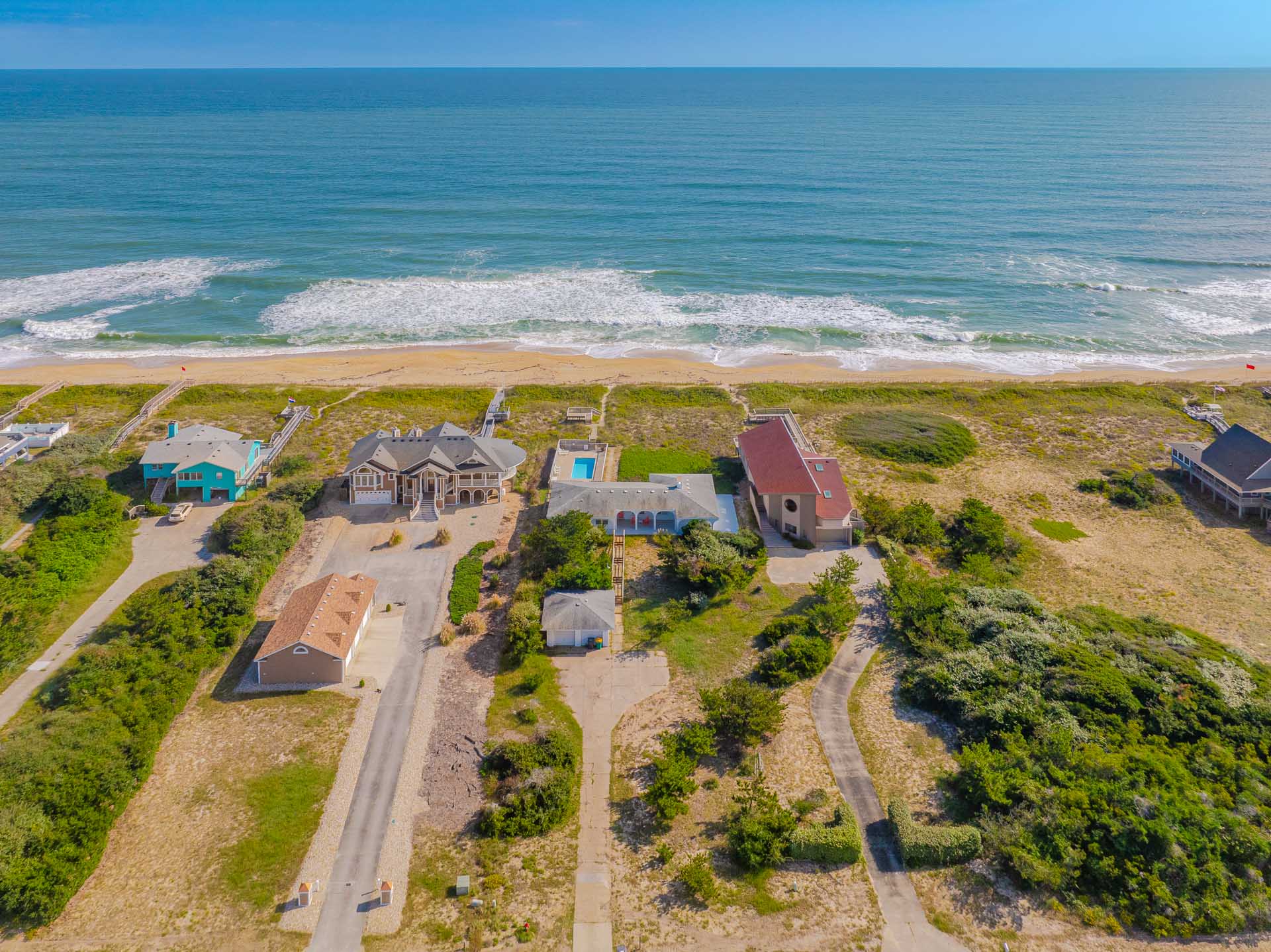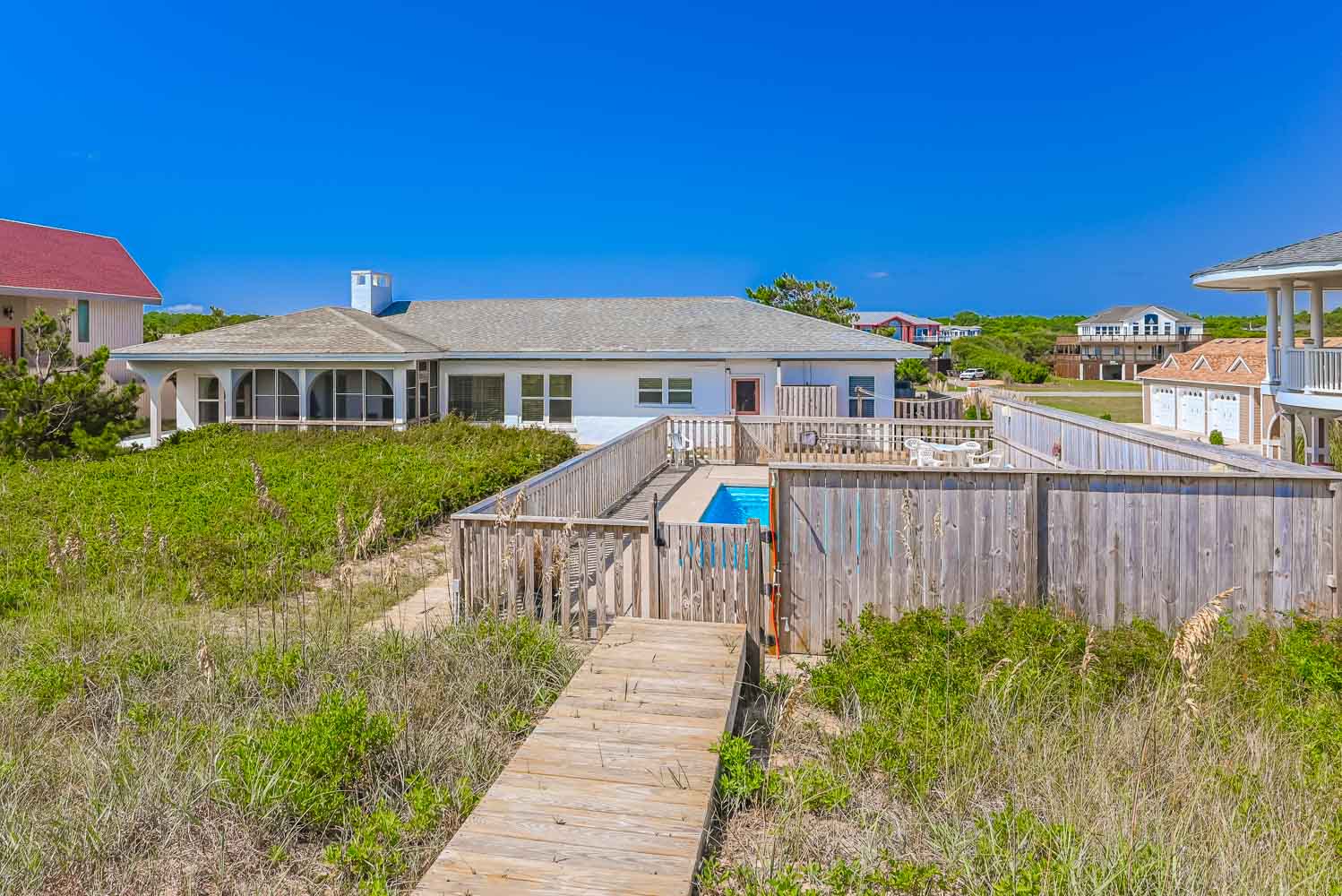 Main Level: Parking for 4 Cars, Separate Garage, Covered Porch, Entry to Home, Living/Dining/Kitchen Area, TV, 4 Bedrooms (Private Suite w/King, TV, Full Bath w/Garden Tub, Shower, Washer/Dryer; Private Suite w/Single, Full Bath w/Shower; 1w/Double, Single, TV; 1 w/2 Singles), Full Hall Bath w/Shower, Screened Porch w/Gas Grill, Private Oceanfront Swimming Pool, Large Sun Deck, Covered Deck, Enclosed Outside Shower, Dune Top Deck, Sand Path to Beach.