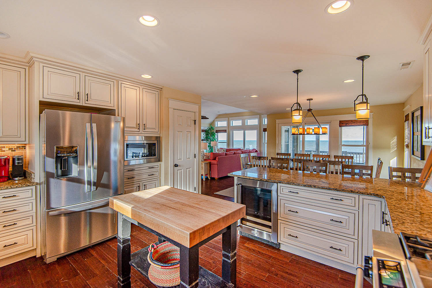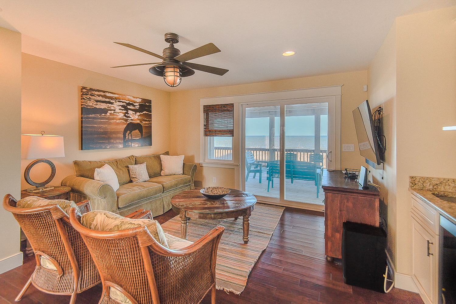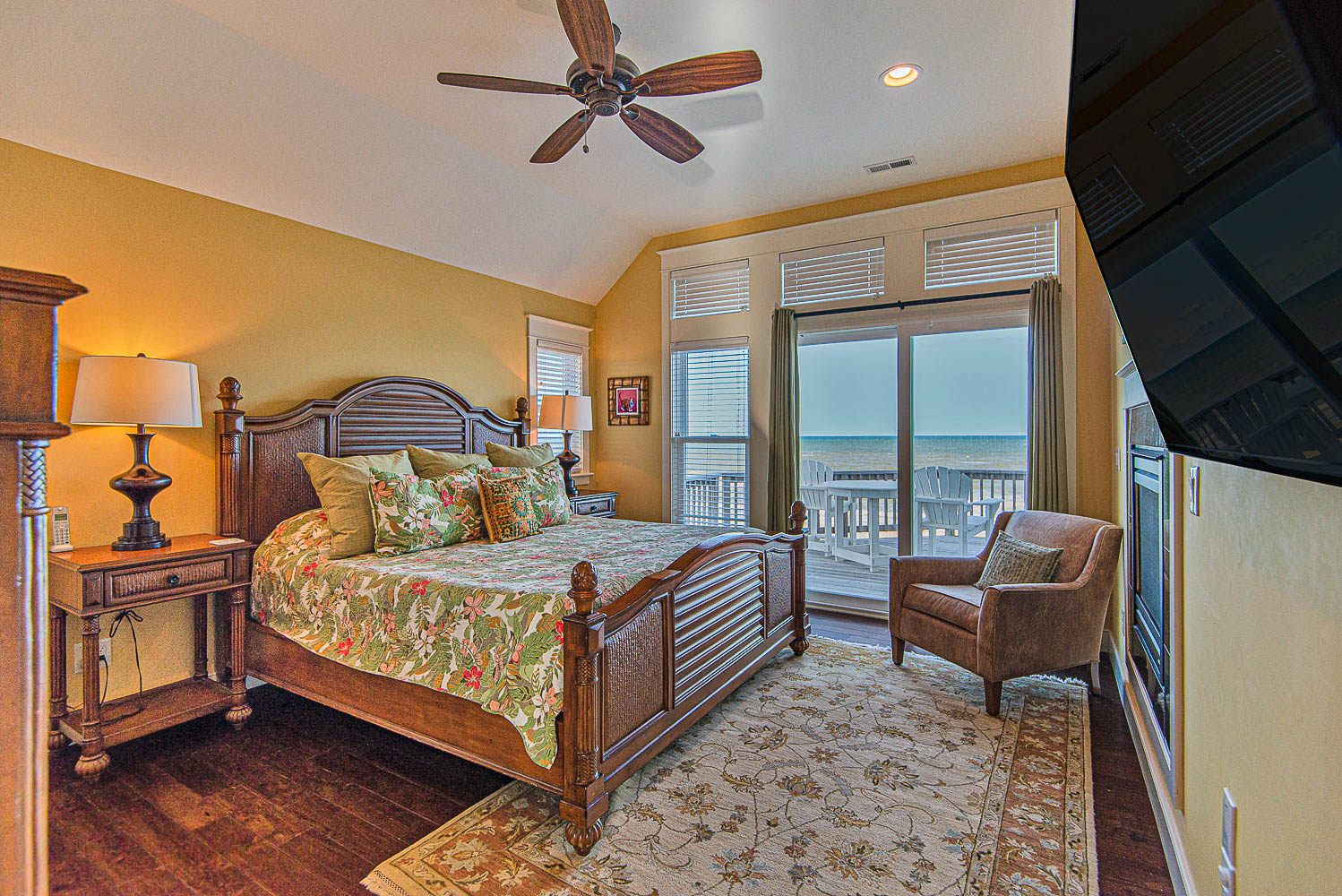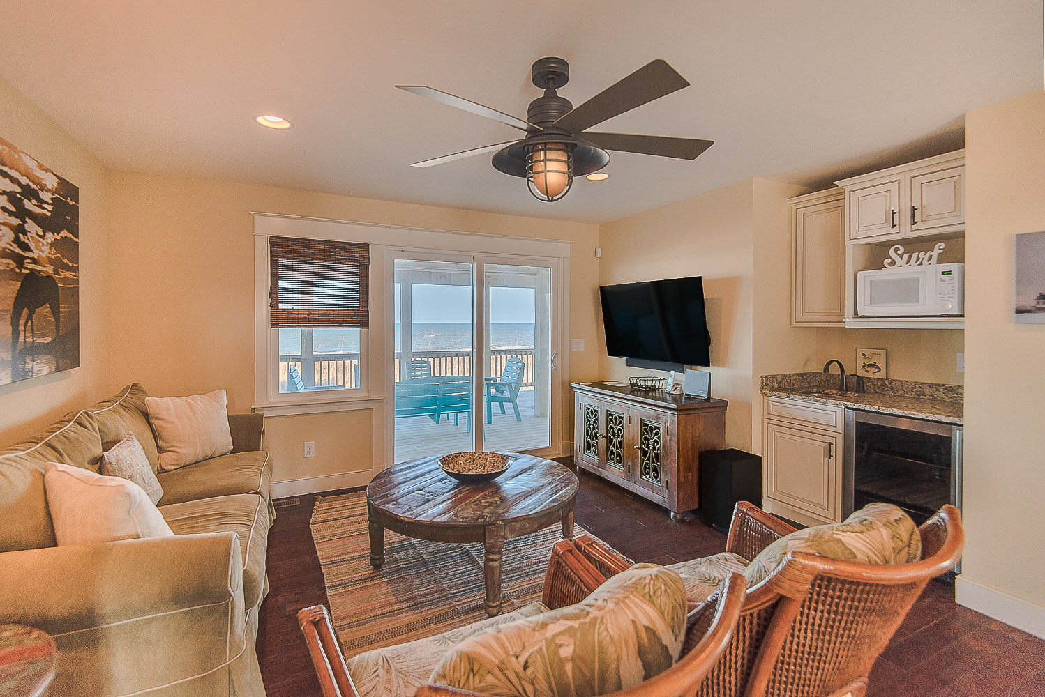 Top Level: Living/Dining/Kitchen Area, Large Flat Screen TV, Gas Fireplace, Ocean and Beach Views, Granite Count Tops, Half Bath, 1 Private Suite w/King, Gas Fireplace, and Full Bath w/Tub and Shower, 1 Private Suite w/King and Full Bath w/Tub, Screen Porch w/Deck Furniture, and Sun Deck.