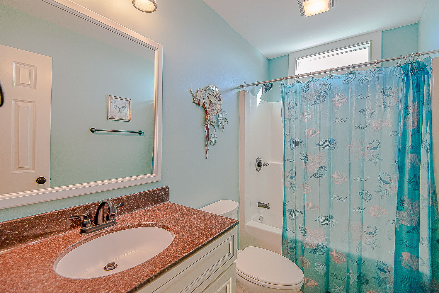 Mid Level: Large Den, TV, Wet Bar, Microwave, Mini-Refrigerator, 5 Bedrooms (Oceanfront w/King, TV, Access to Covered Deck; Jack n Jill Full Bath w/Tub/Shower; 1 w/2 Bunk Sets, TV, Oceanfront w/Queen, TV, Access to Covered Deck, 1 w/Queen, TV, Private Suite w/2 Doubles, TV, Full Bath), Laundry Area, Full Hall Bath w/Shower, West Side Covered Deck, and a Huge Double-Sized Oceanfront Covered Deck, Deck Furniture, and Ocean Views.