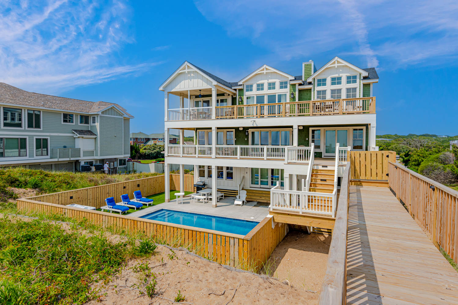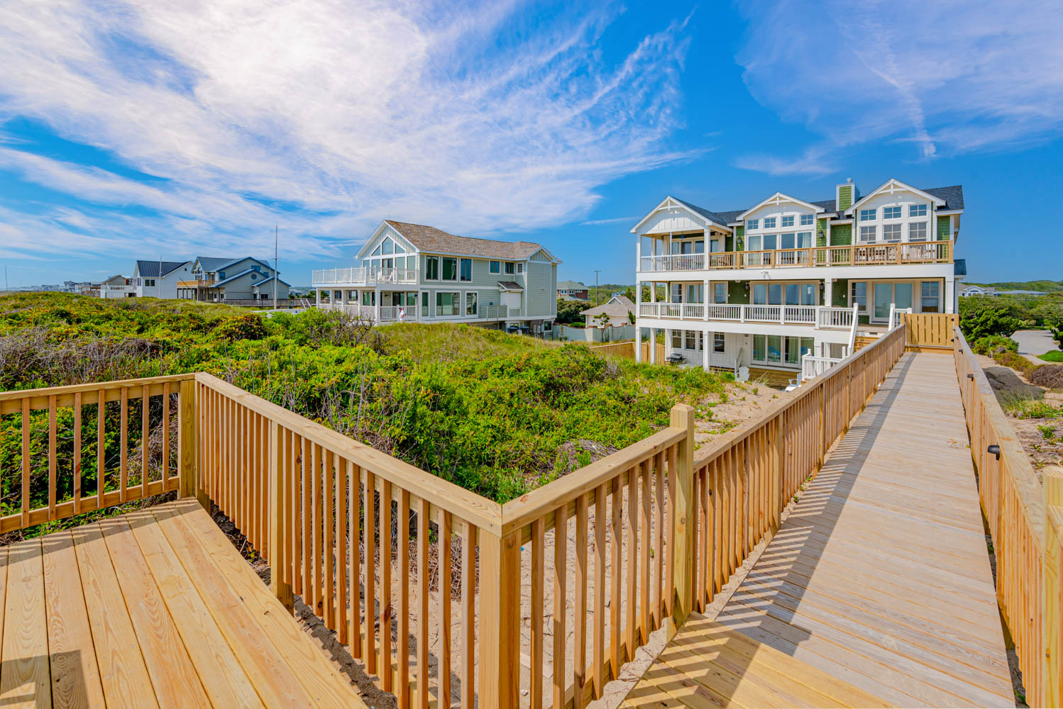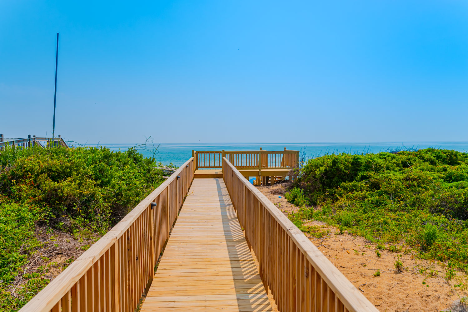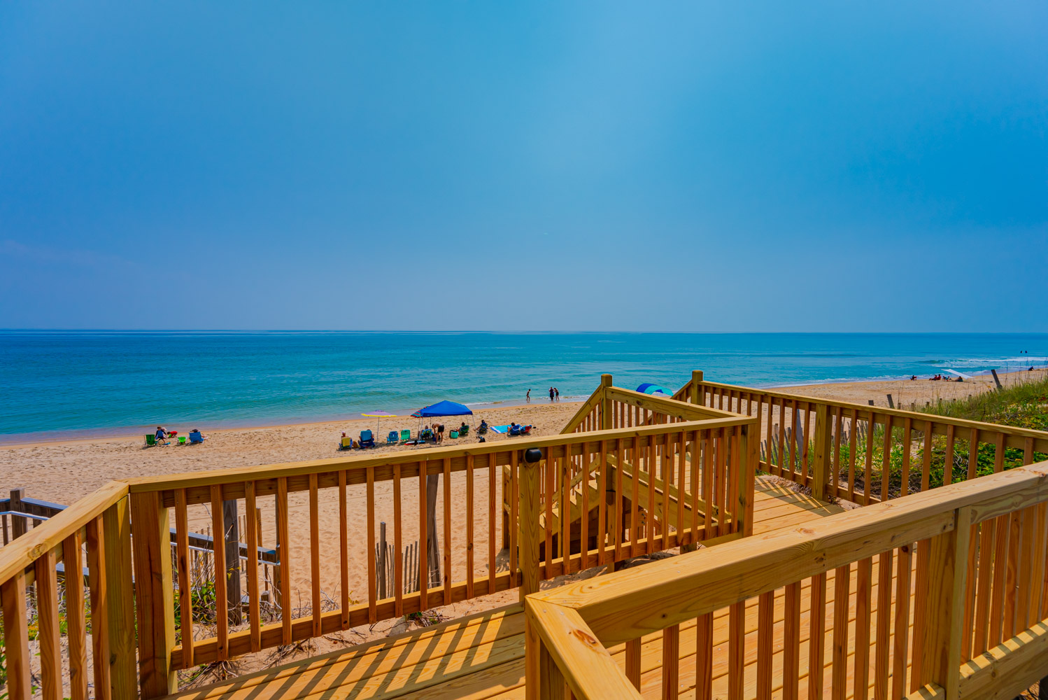 Level Two: 4 Bedrooms (2 Private Suite w/Kings, TVs, and Full Bath w/Tub and Shower, 1 w/King and TV, 1 w/2 Bunk Sets and TV), Shared Full Bath, Den w/TV, Ocean Views, Covered Porch, Hammock, and Walkway to Beach w/Staircase to Pool Area.