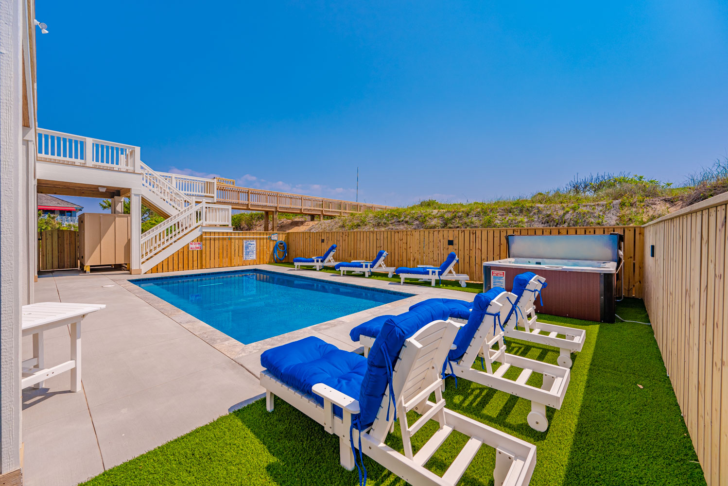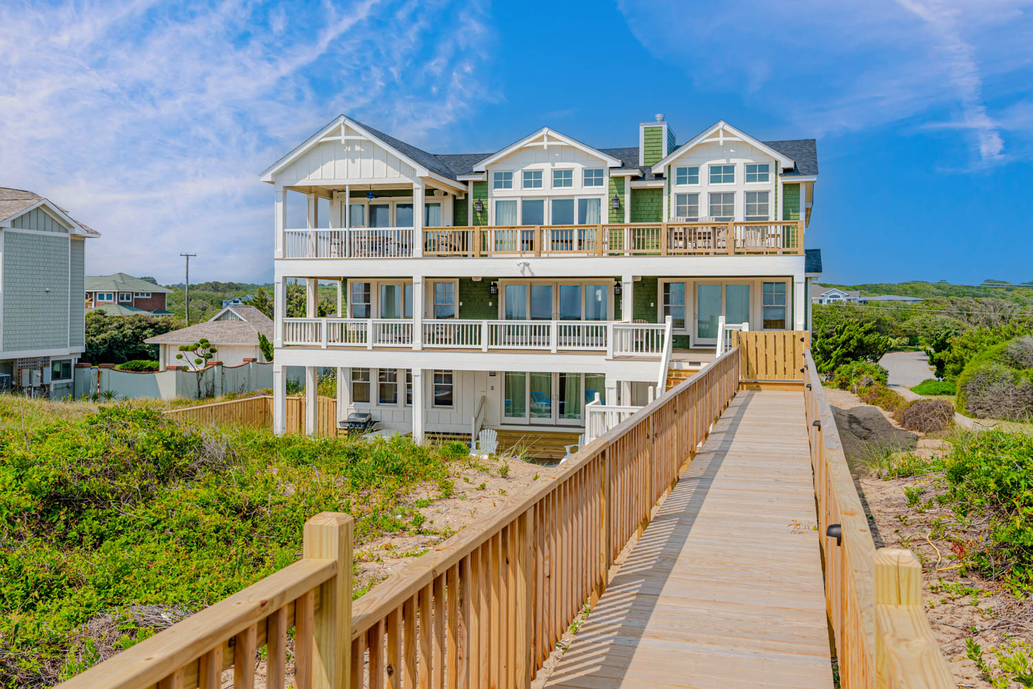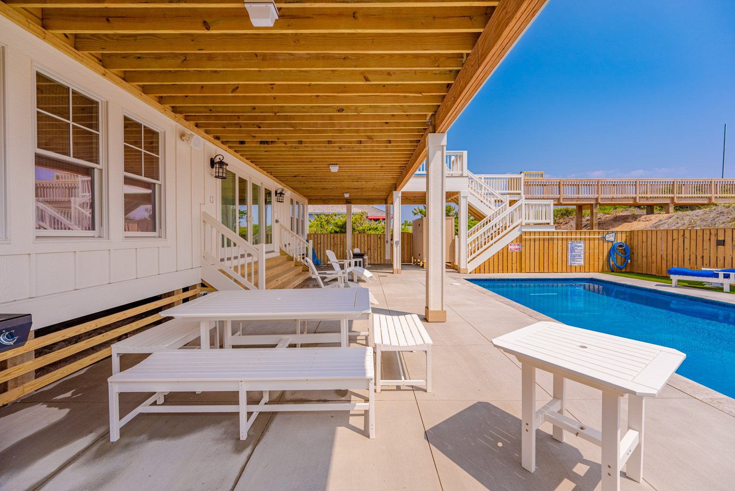 Level Two: 4 Bedrooms (2 Private Suite w/Kings, TVs, and Full Bath w/Tub and Shower, 1 w/King and TV, 1 w/2 Bunk Sets and TV), Shared Full Bath, Den w/TV, Ocean Views, Covered Porch, Hammock, and Walkway to Beach w/Staircase to Pool Area.
