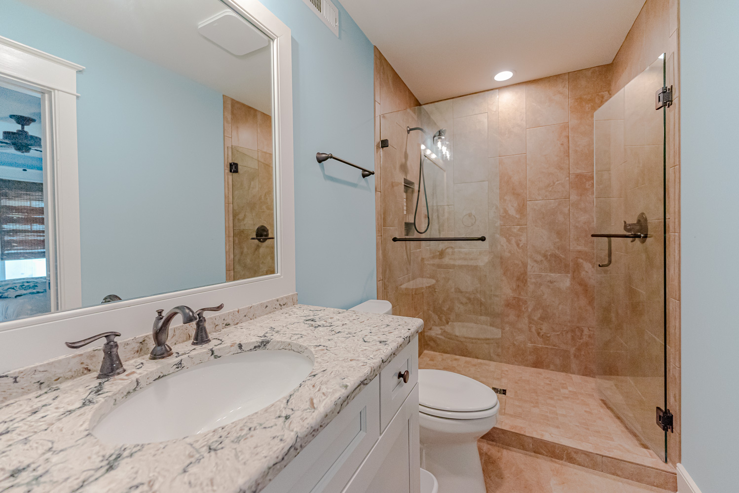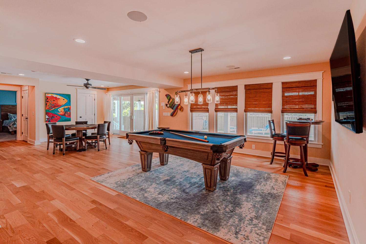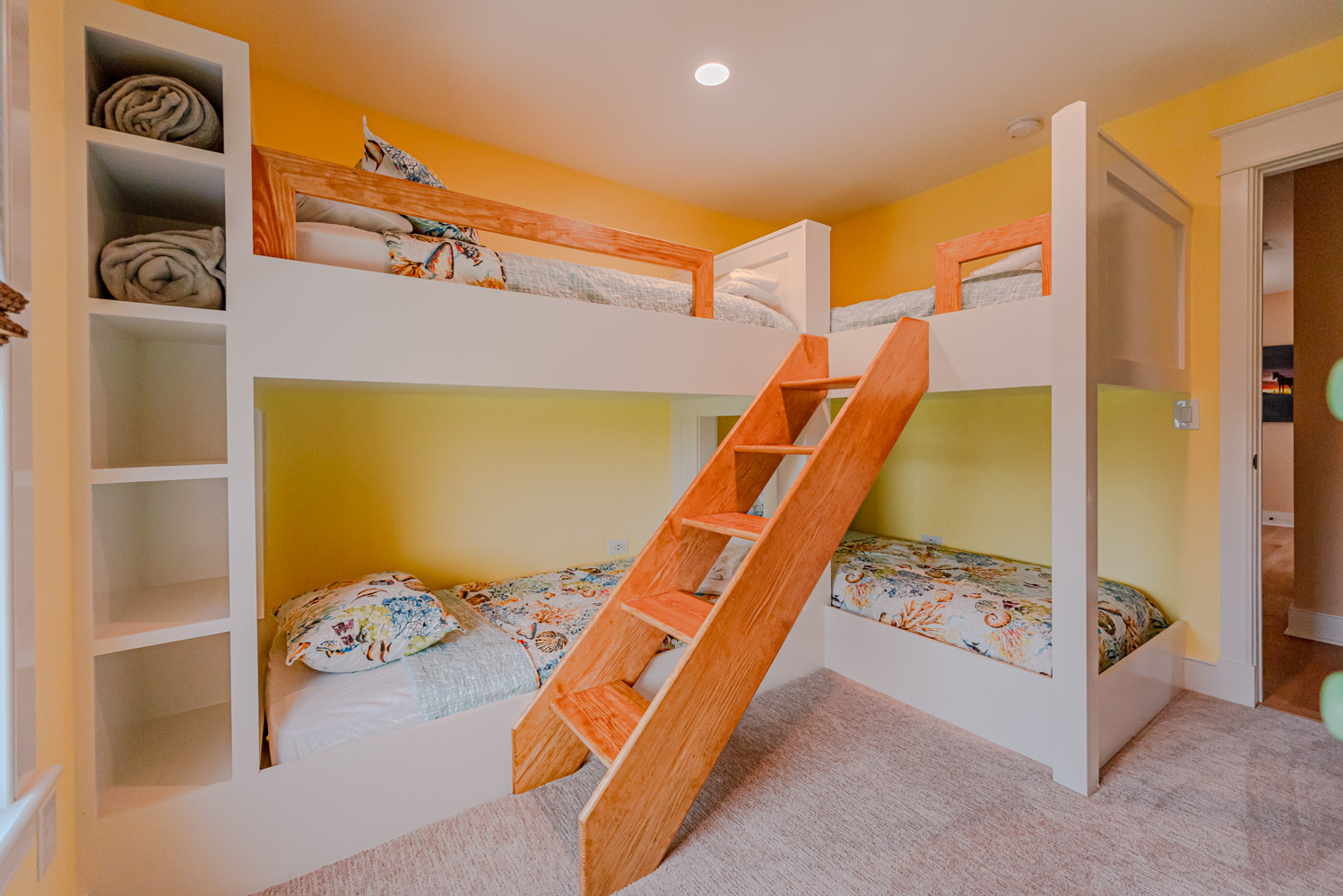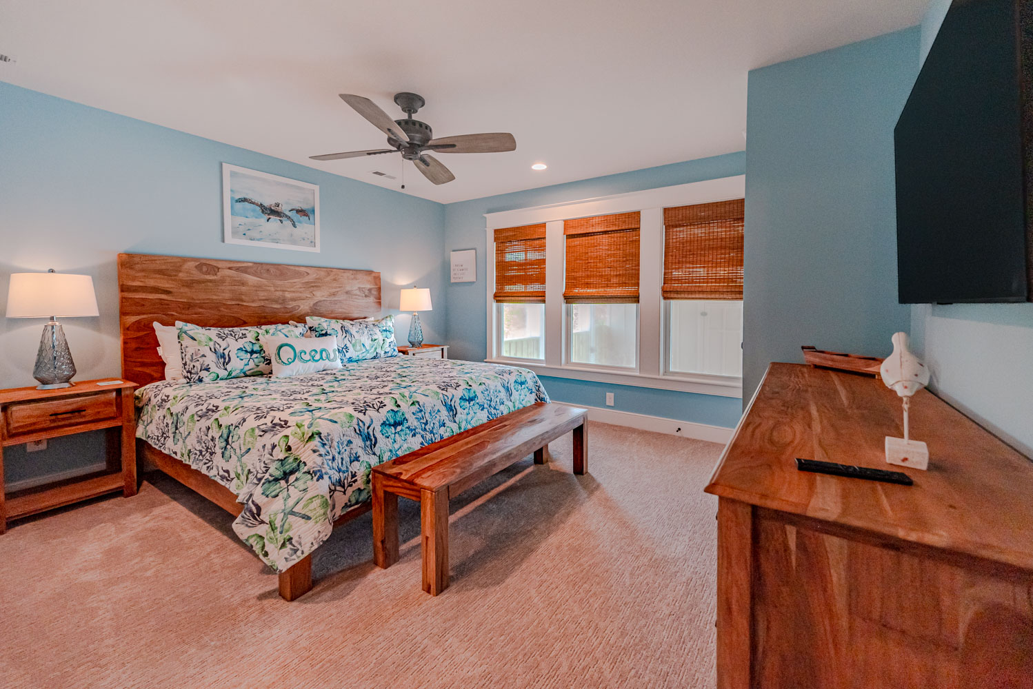 Level Two: 4 Bedrooms (2 Private Suite w/Kings, TVs, and Full Bath w/Tub and Shower, 1 w/King and TV, 1 w/2 Bunk Sets and TV), Shared Full Bath, Den w/TV, Ocean Views, Covered Porch, Hammock, and Walkway to Beach w/Staircase to Pool Area.