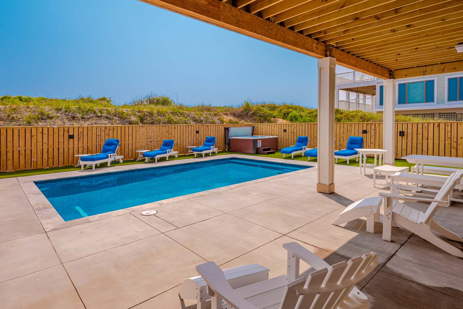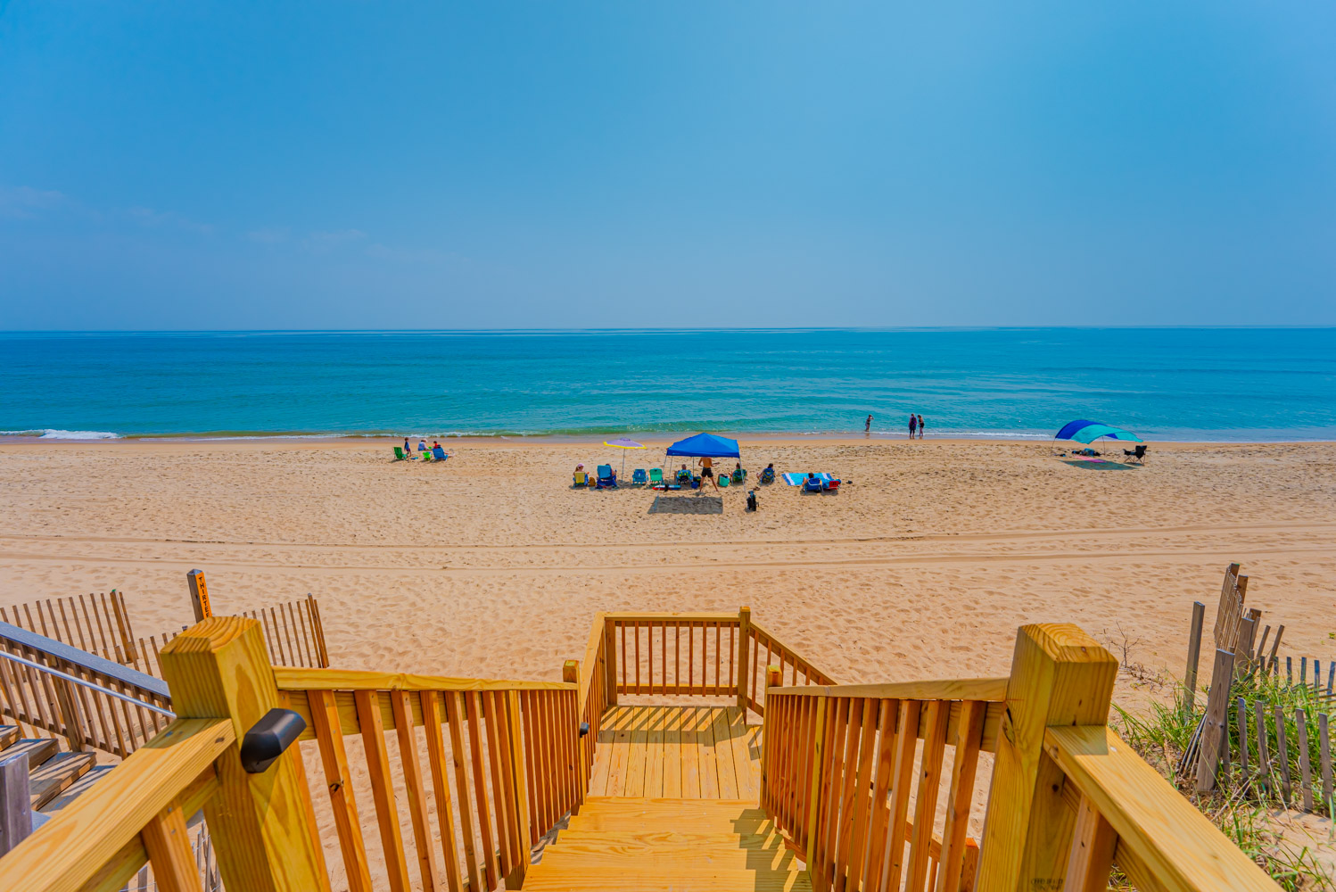 Ground Level: Parking for 6, Covered Entry w/ seven steps to Enter Level One, Private Heated Swimming Pool - Open Seasonally (Can be Heated for $300.00 Per Week, Plus Tax, Please Bear in Mind That Pool Temperature is Subject to Outside Temperatures and Conditions), Hot Tub, and Patio Area with Steps to Private Walkway to Beach.