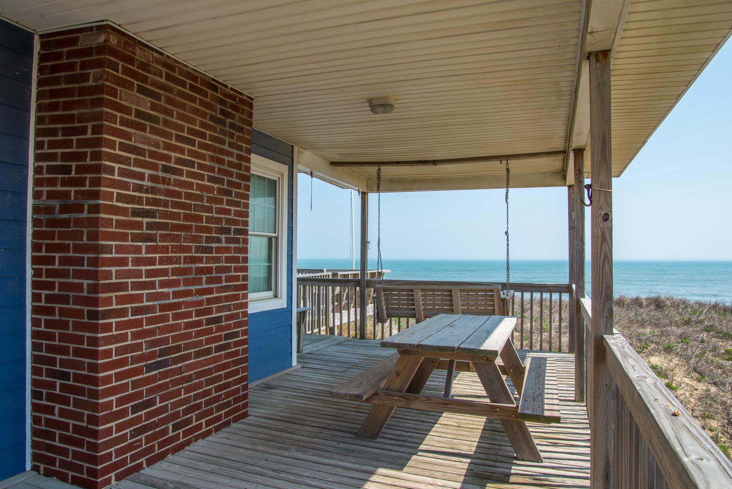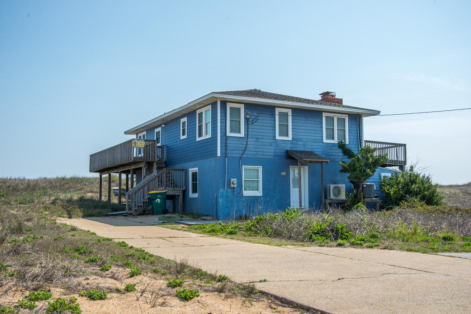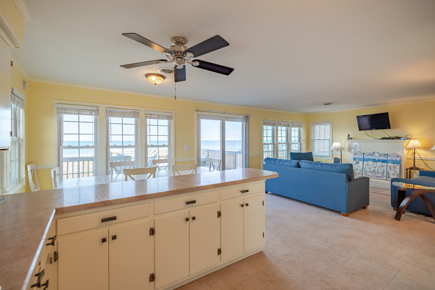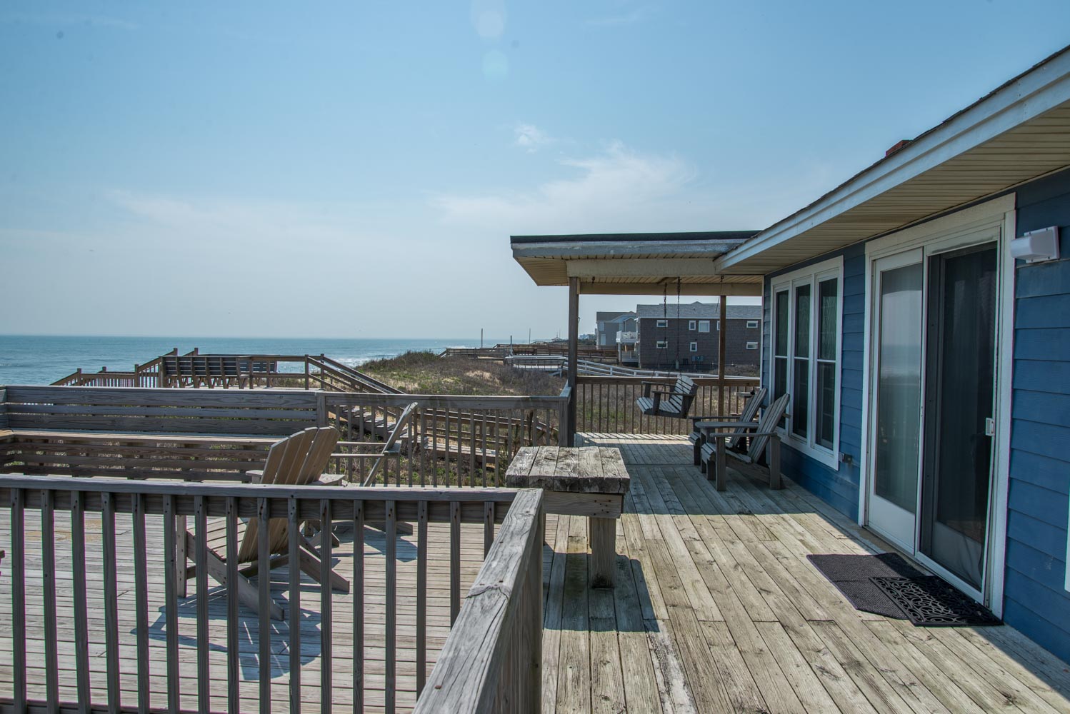 Top Level: Living/Dining/Kitchen Area, TV, Ocean Views, 2 Bedrooms (Private Suite w/King & Full Bath & 1 w/Double Bunk Set), Hall Bath, Large Sun Deck, Covered Deck, Enclosed Outside Shower, & Steps to the Beach.