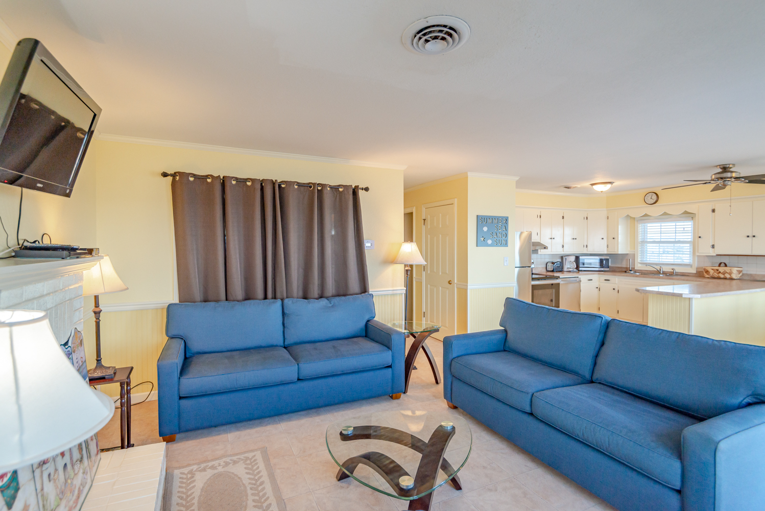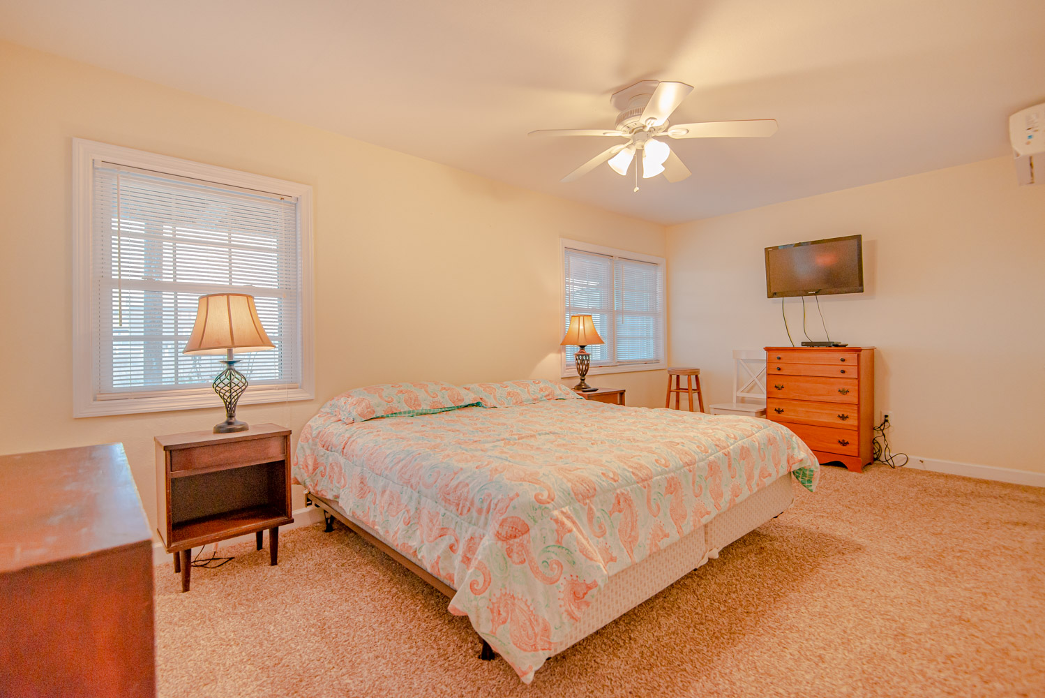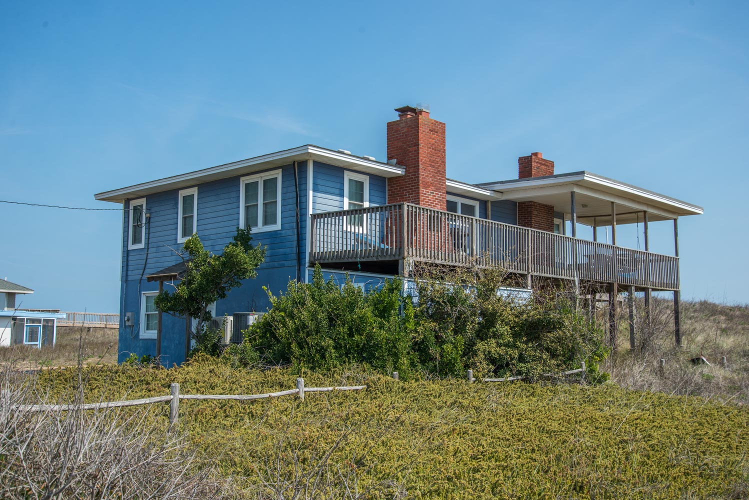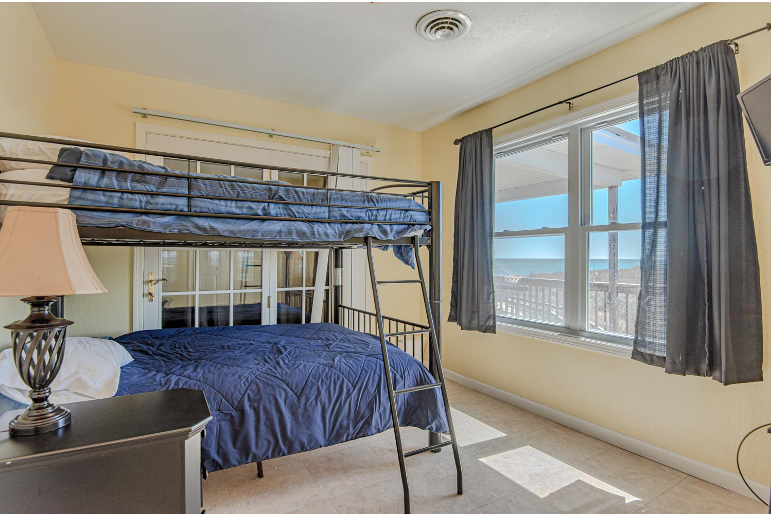 Top Level: Living/Dining/Kitchen Area, TV, Ocean Views, 2 Bedrooms (Private Suite w/King & Full Bath & 1 w/Double Bunk Set), Hall Bath, Large Sun Deck, Covered Deck, Enclosed Outside Shower, & Steps to the Beach.