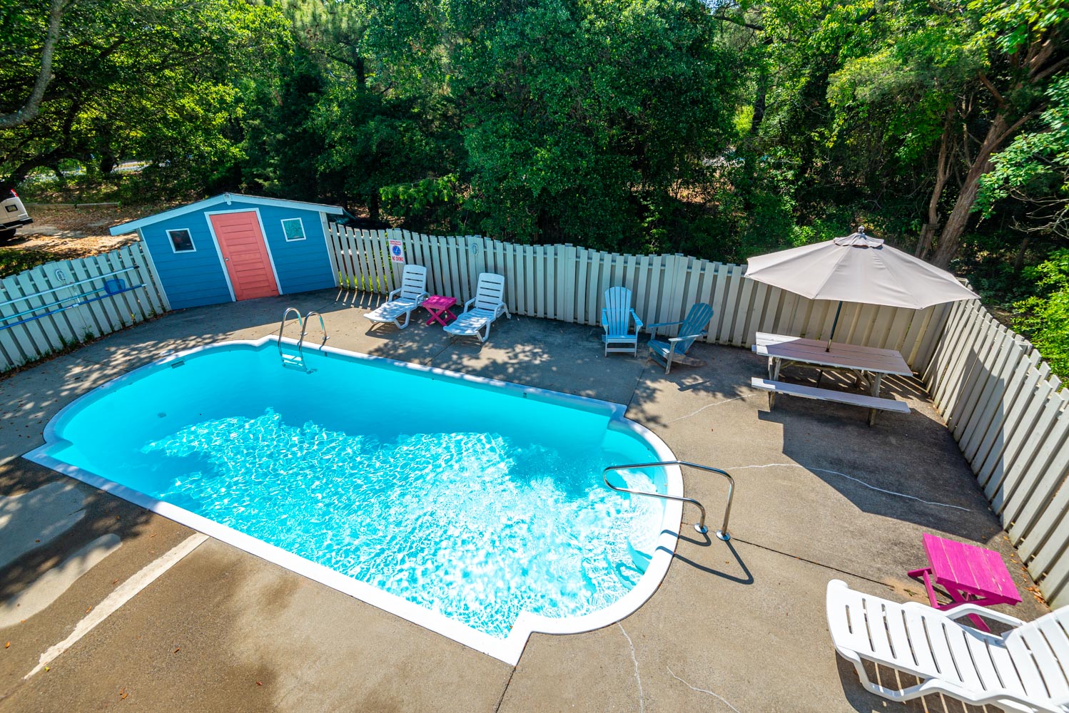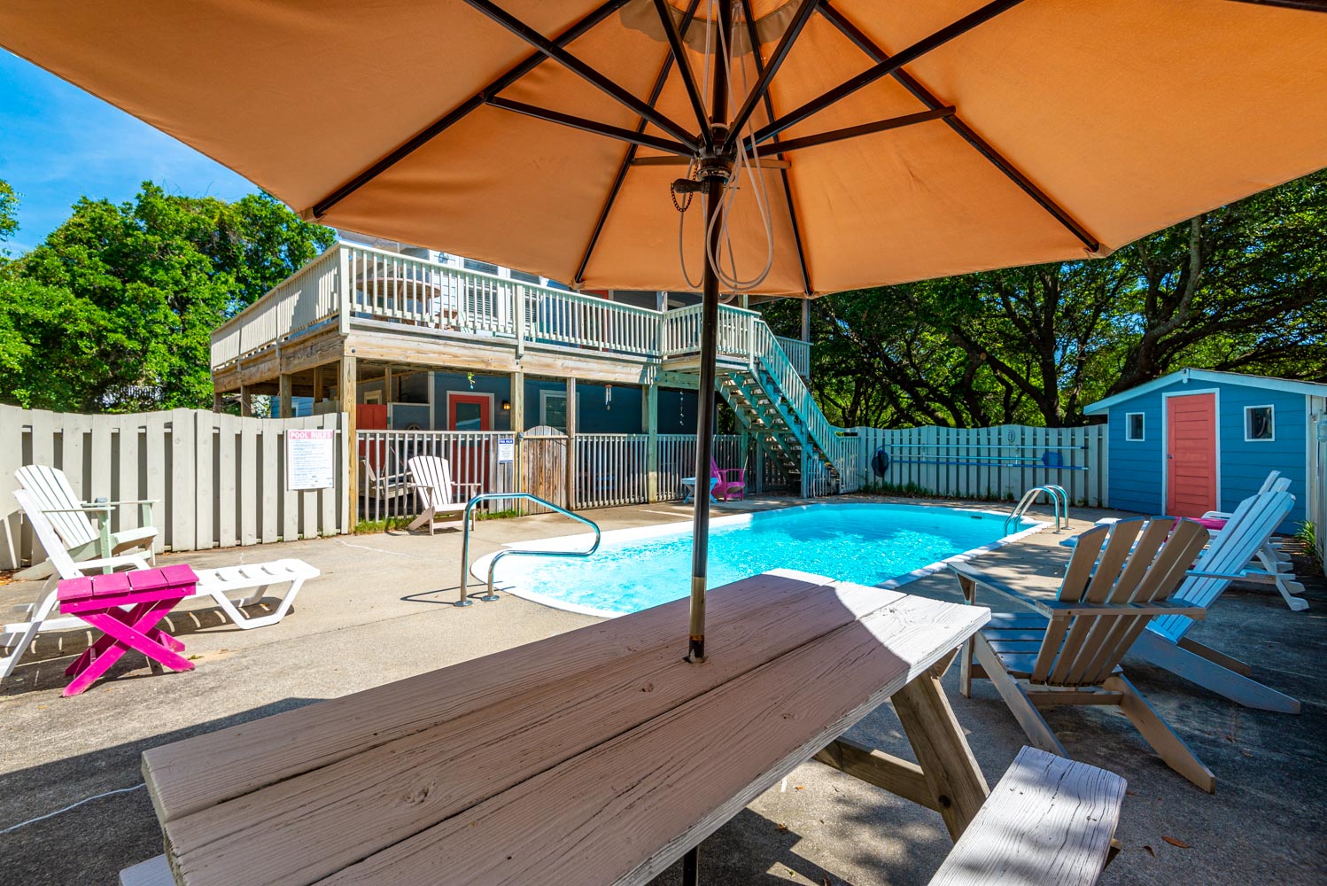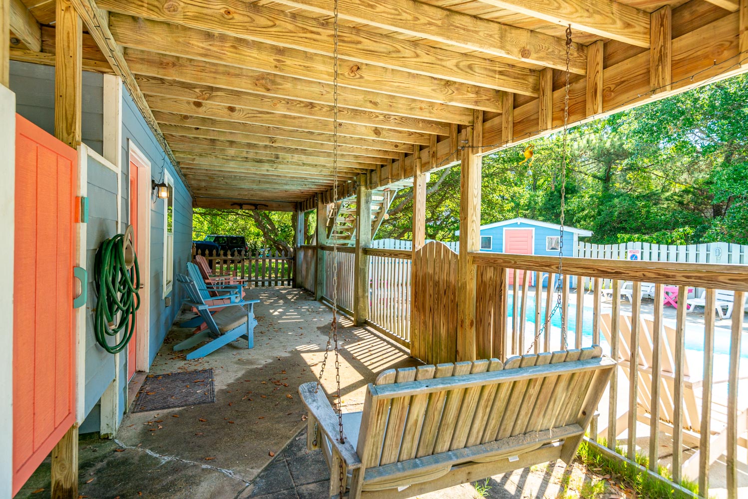 Ground Level: Parking for 4 Cars, Covered Sitting Area, Porch Swing, Shaded Area, Entry to Home, Rec. Room, Pool Table, TV, Stereo w/CD, Full Size Refrigerator, Bedroom w/King, and TV, bonus room w/2 Duo Bunks, and TV, Full Bath, Laundry Area, Access to Patio Area, Private 14 x 28 Saltwater Swimming Pool - Open Seasonally, Hot Tub, Park Grill, and Enclosed Outside Shower.